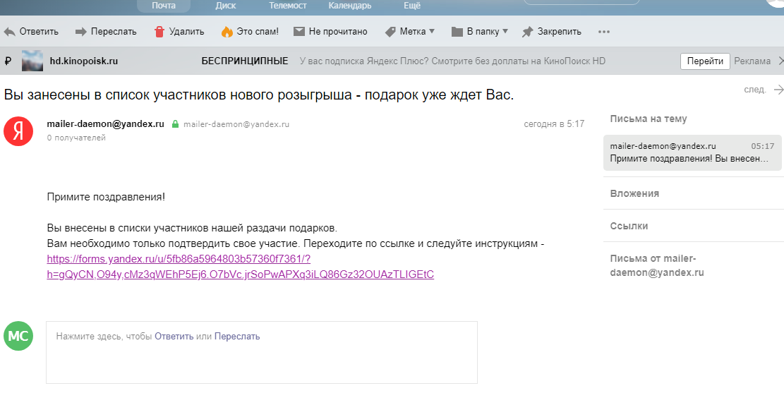 Сегодня утром на яндекс-почту пришло письмо следующего содержания: