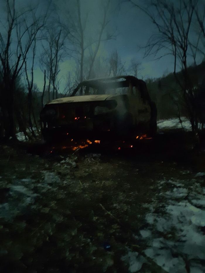 И вот, на обратной дороге, смеркалось, УАЗ в какой-то момент пропал из видимости сзади, на вопрос по рации: "все ли хорошо?", я услышал: "мы горим!", остановил машину и мы со штурманом побежали на помощь. Но как бы и чем не тушили, махом разгоревшееся пламя в моторном отсеке, так сбить и не смогли. Потом хлопнул АКБ, начали взрываться покрышки, раздувая пламя вокруг, к 40й минуте дело дошло и до бензобаков, которые, вопреки киношным спецэффектам, не взорвались, а просто сильно загорелись столбом пламени. Тут я стал переживать за лес вокруг, ибо связи нет, цивилизации нет, чтобы сообщить о лесном пожаре - надо еще 20км ехать до деревни со связью. Но обошлось, лес тлел вокруг, но разгораться не собирался.