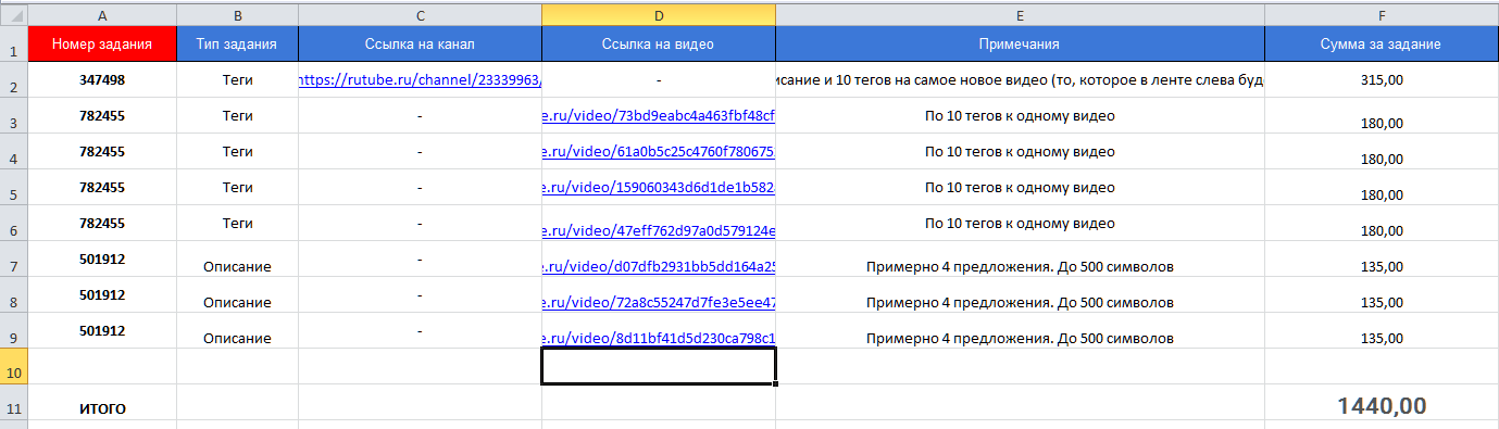 Обучение - это три видео продолжительностью 5-10 минут. В них нам показывают, как создать канал на rutube, попутно сообщают, что если создавать не хочется - можно обратиться к наставнику, и он предоставит аккаунт. Демонстрируют, как написать комментарий, акцентируют, что он должен быть содержательным и не меньше 4 слов, показывают, как сделать и сохранить скриншот экрана с комментарием. Следующий тип задания у них - подбирать теги. Так же в обучении дают советы, как это делать, исходя из названия канала и названия и описания видео, а также с помощью сайта keywordtool.io/ru. И наконец, написание описаний к видео. Вот тут, конечно, обучение подкачало, просто показали пример, а каких-то практических рекомендаций по структуре, по тому, как сделать описание "продающим" пожалели. 4 предложения, 500 символов - и учитесь на практике!