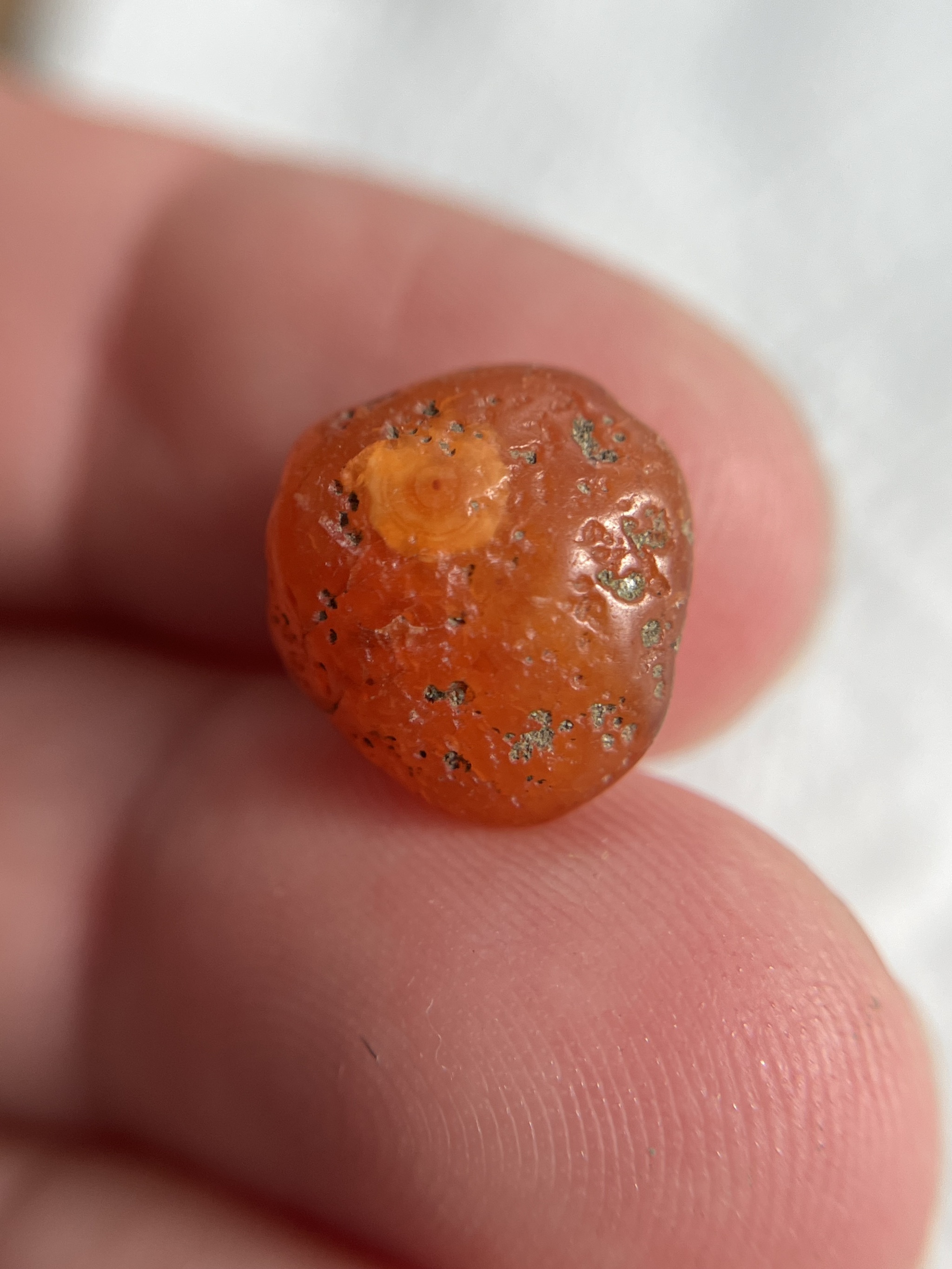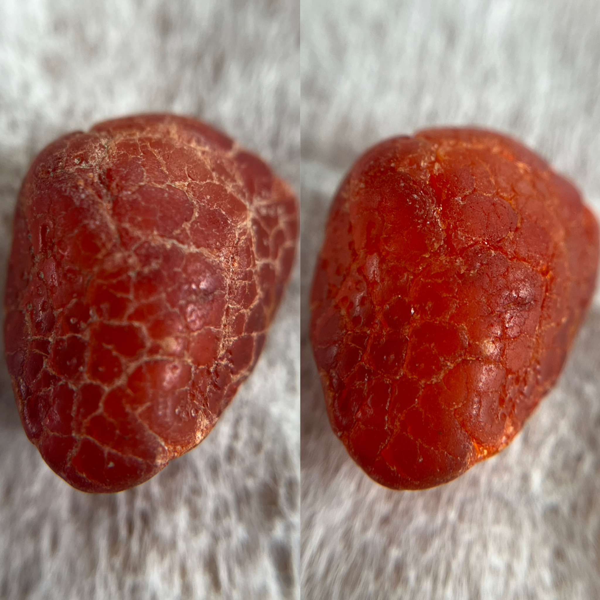 Еще один важный момент - это время работы УЗ ванны. Первоначально я выставила таймер на 15 минут. Некоторым камням, например яшме, этого было достаточно. На дне ванны сразу появляется осадок в виде грязи и песка. А вот остальные камни я достала практически в неизменном виде. Казалось бы, на этом этапе можно плюнуть и забросить эксперимент, но я решила, пусть ванна отработает на всю катушку. И запустила еще 3 таких 15 минутных цикла. Между ними я осматривала камни и прогресс очистки. Воду в этот момент можно и не менять. Но важно переворачивать камни разными сторонами для достижения максимального эффекта. И это сработало! Но, не со всеми камнями. Ниже пример сердолика после двух или трех 15 минутных циклов.