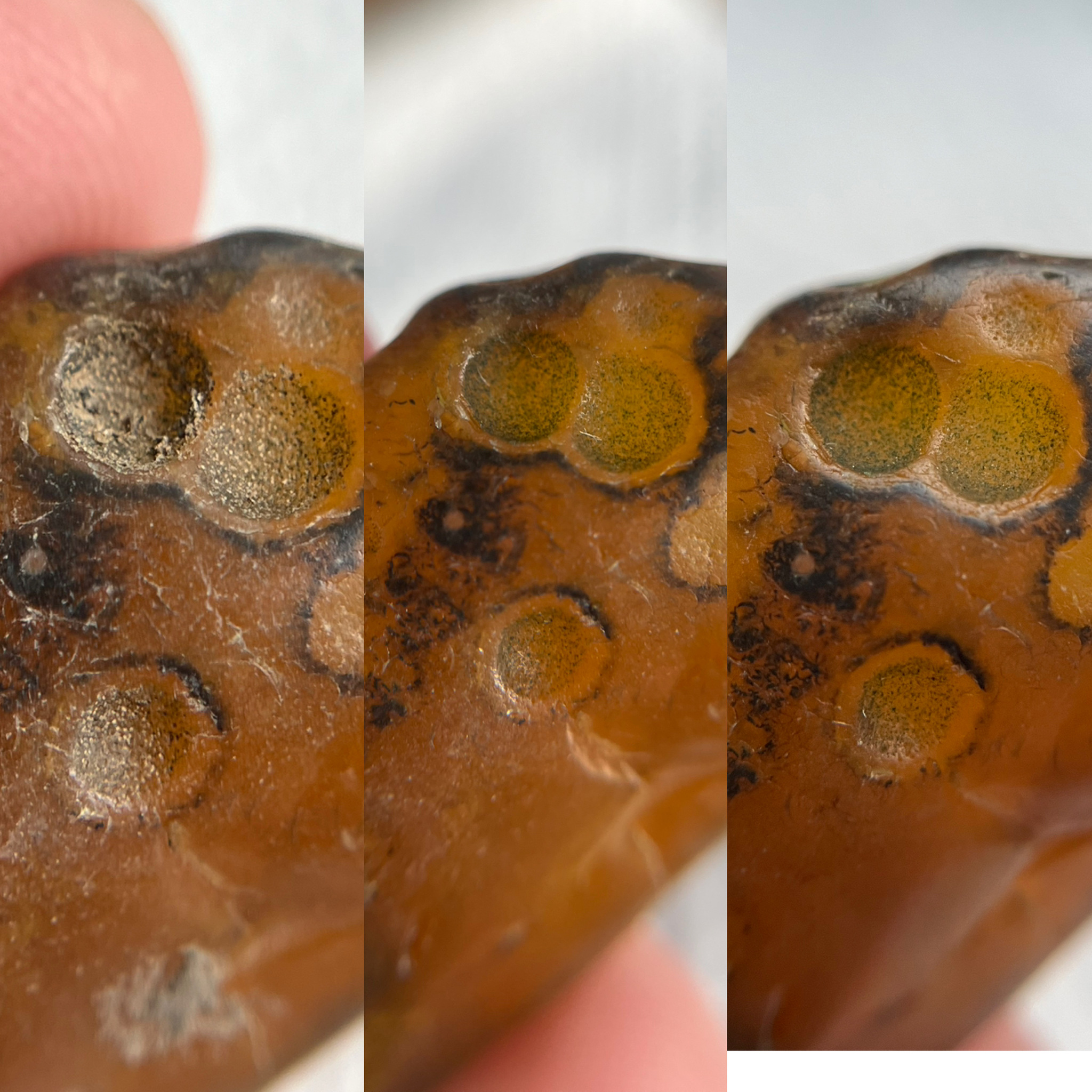 Чуть не забыла, что у нас с вами дожидался еще один сердолик, который мы решили отправить еще на два цикла. Но, к сожалению, разницы я не увидела с промежуточным результатом. Видимо, там уже все зацементировалось. Прикрепляю коллаж: До чистки/УЗ ванна 30мин/УЗ ванна 60 минут