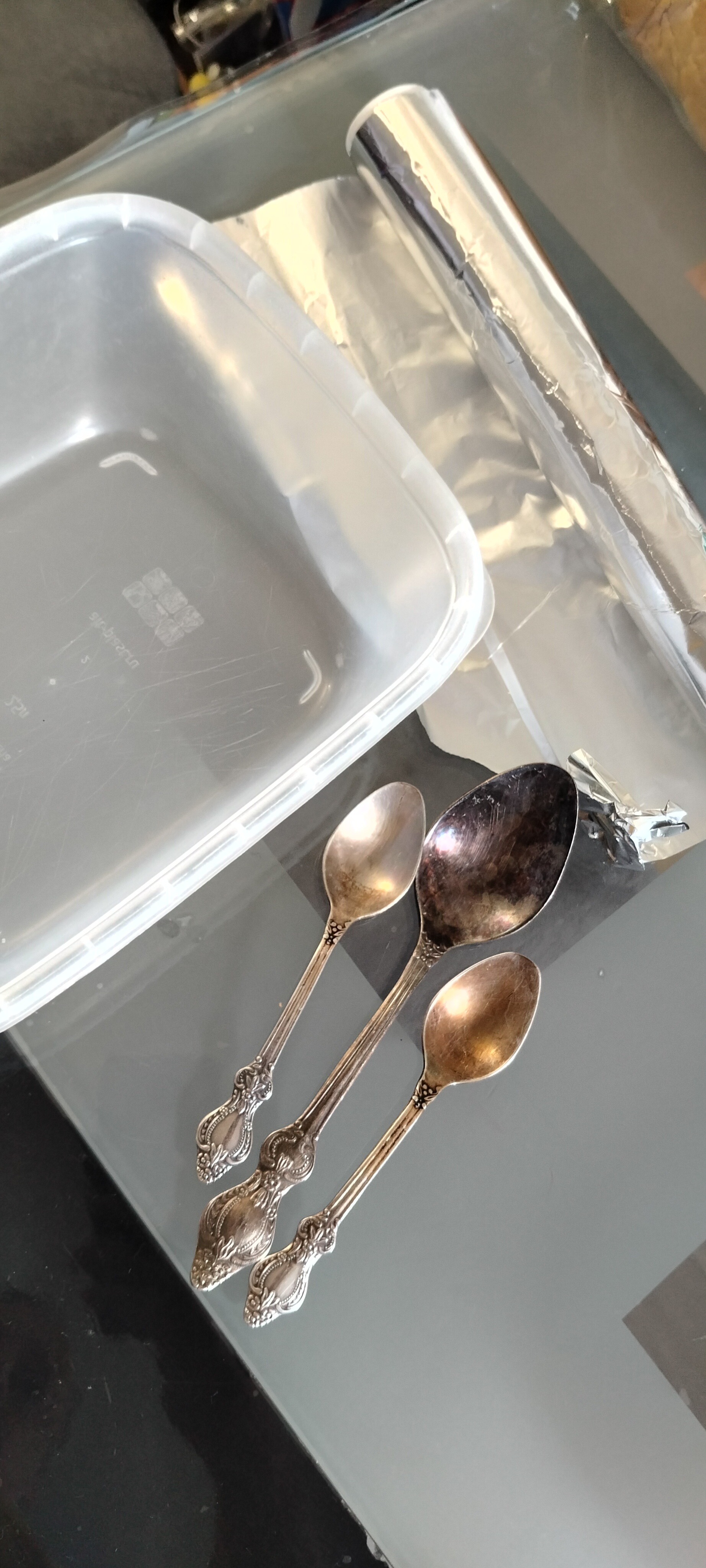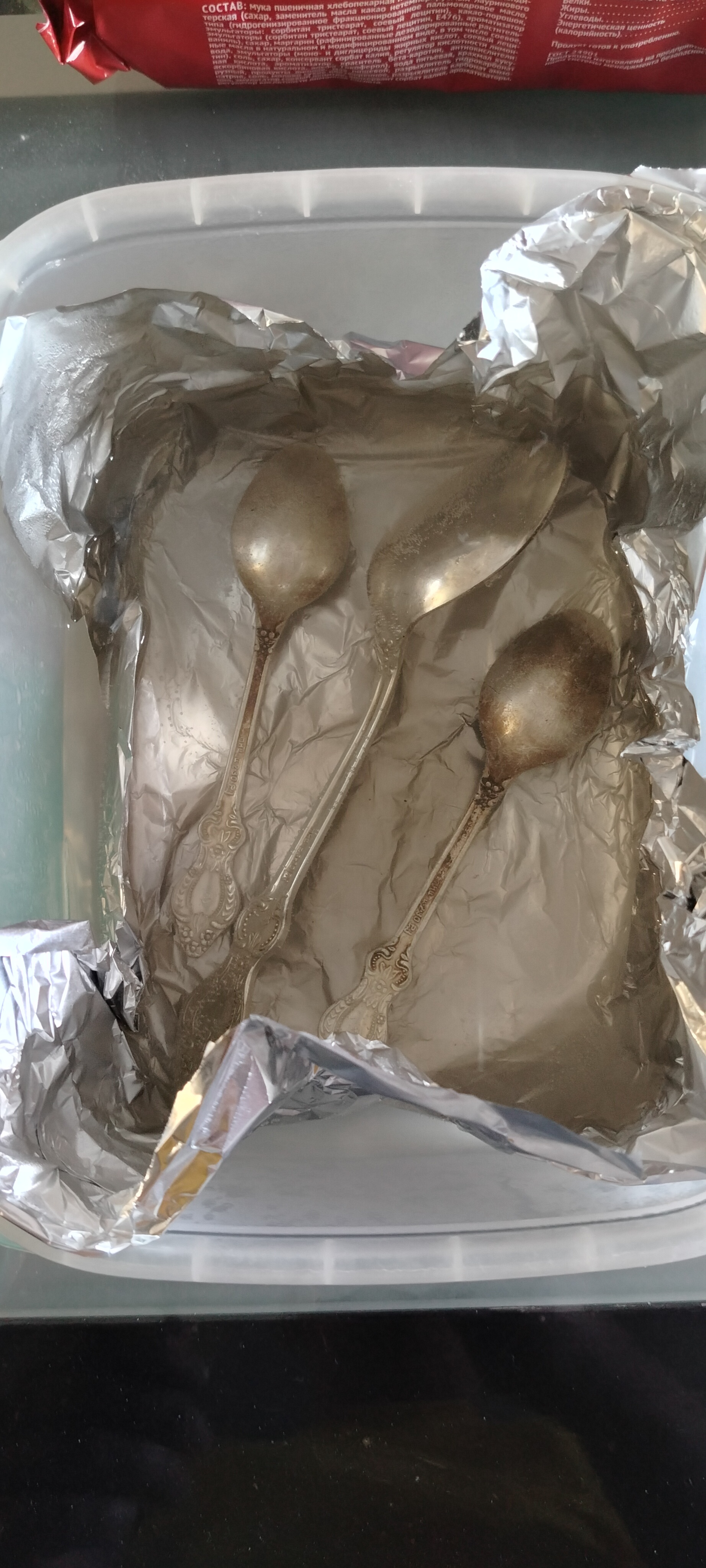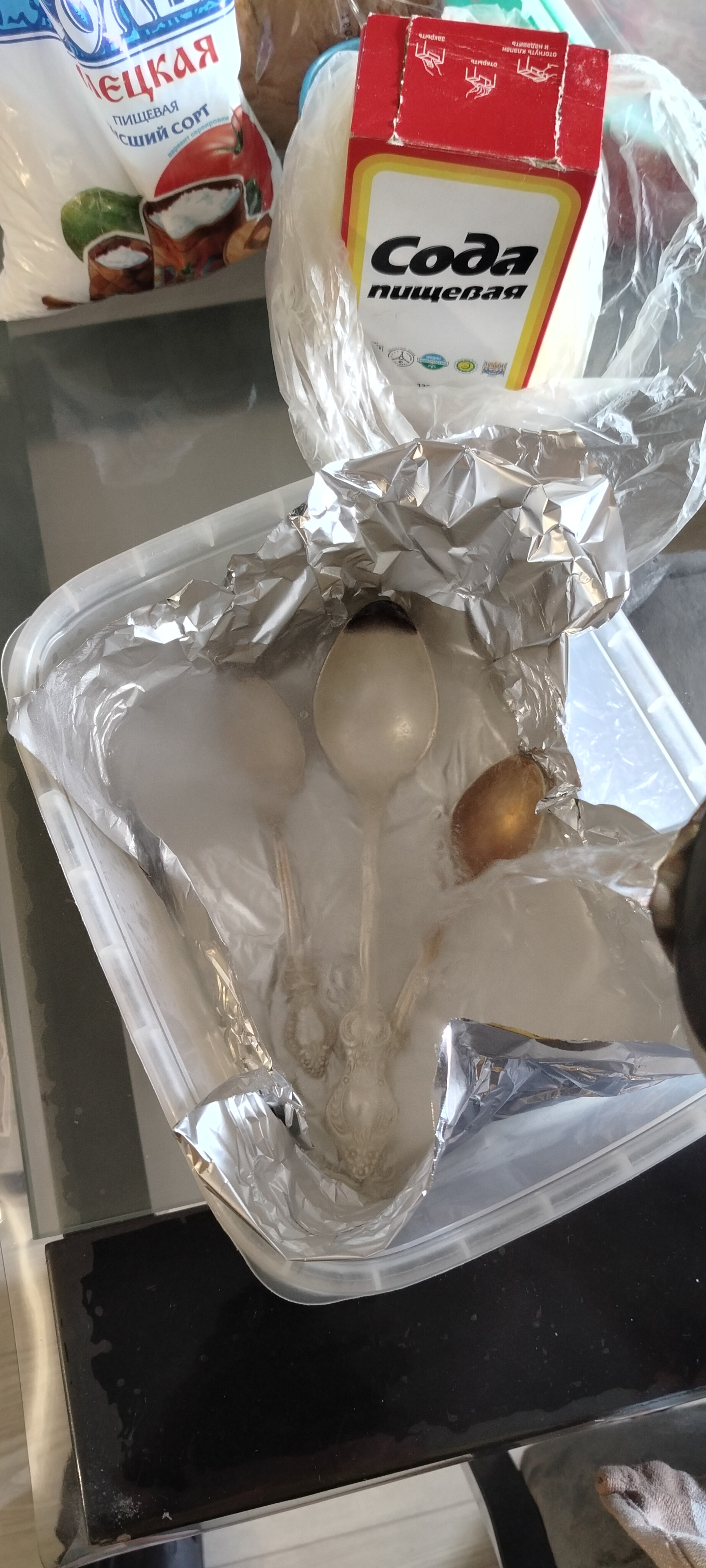 Берём ёмкость, фольгу алюминия для запекания, соду, соль, и кипяток. На дно ёмкости фольгу, соль, соду, ложки, и заливаем кипятком.