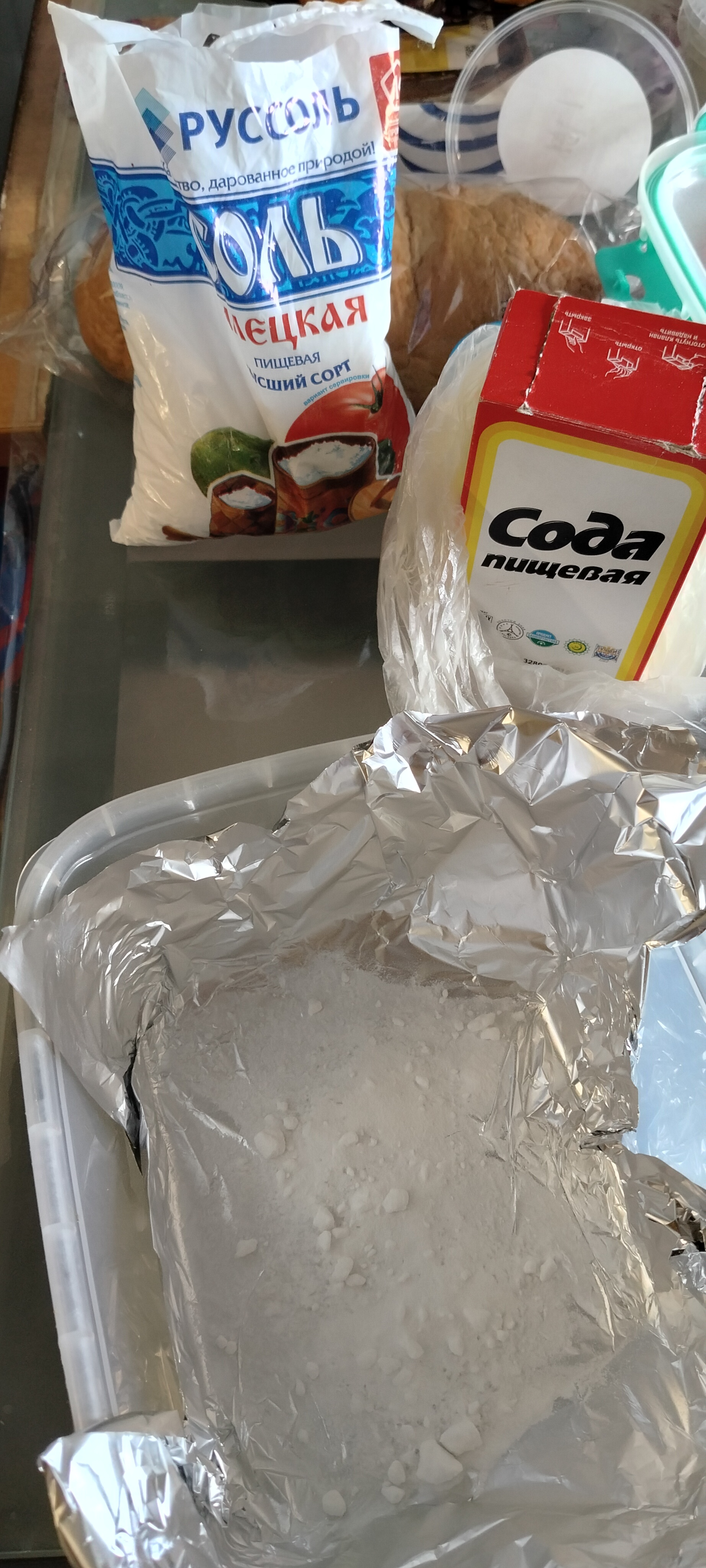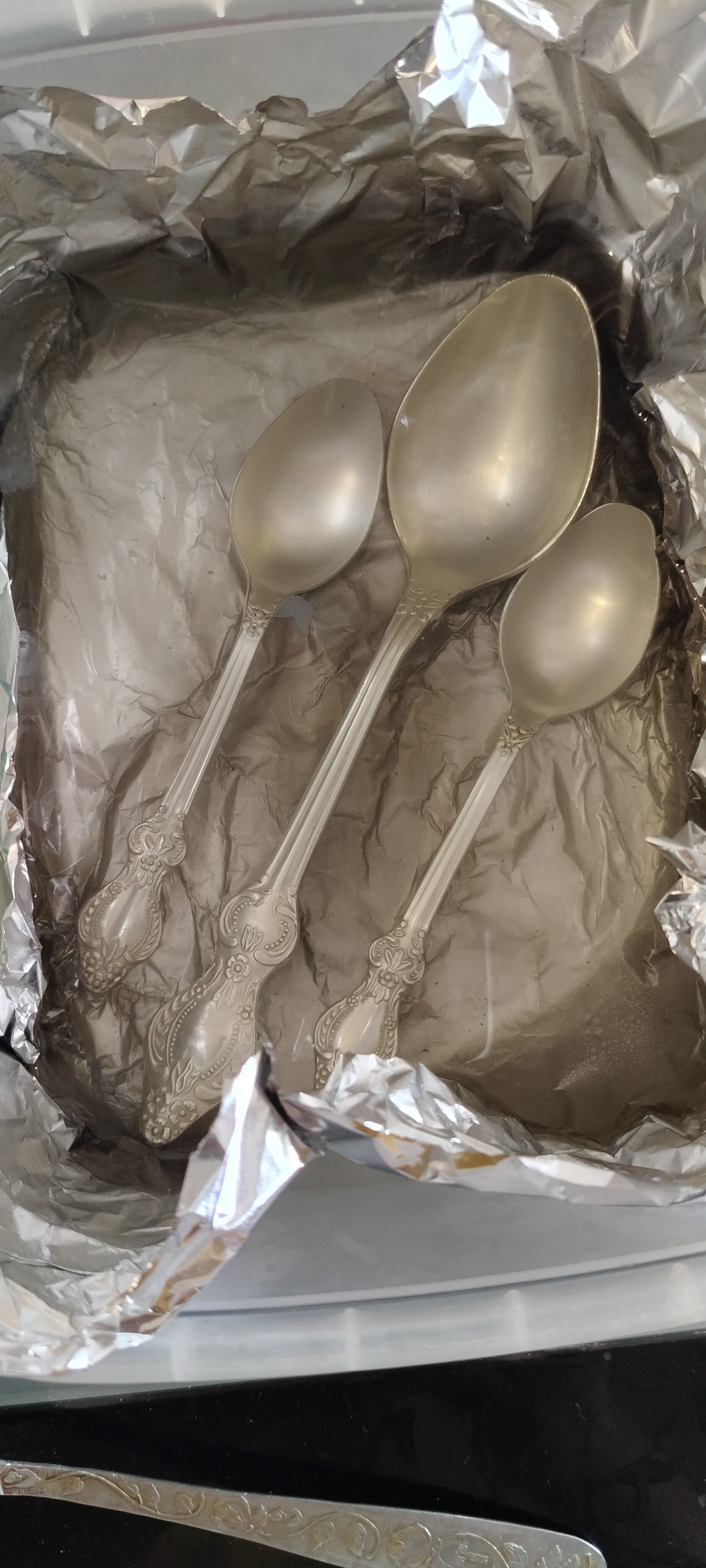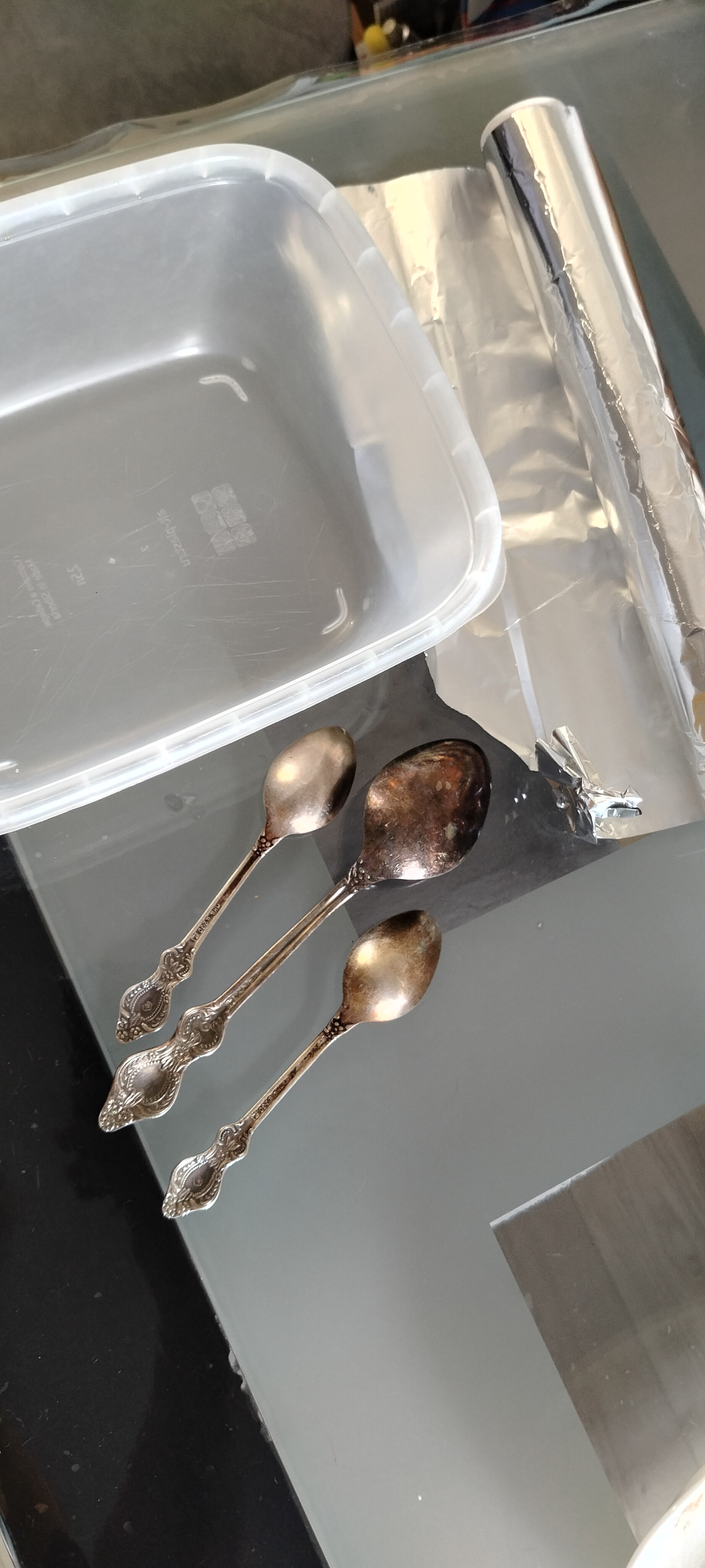 Берём ёмкость, фольгу алюминия для запекания, соду, соль, и кипяток. На дно ёмкости фольгу, соль, соду, ложки, и заливаем кипятком.