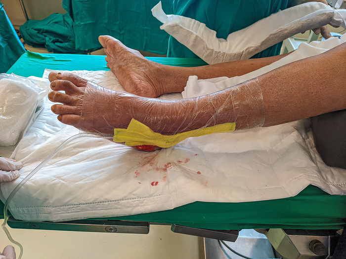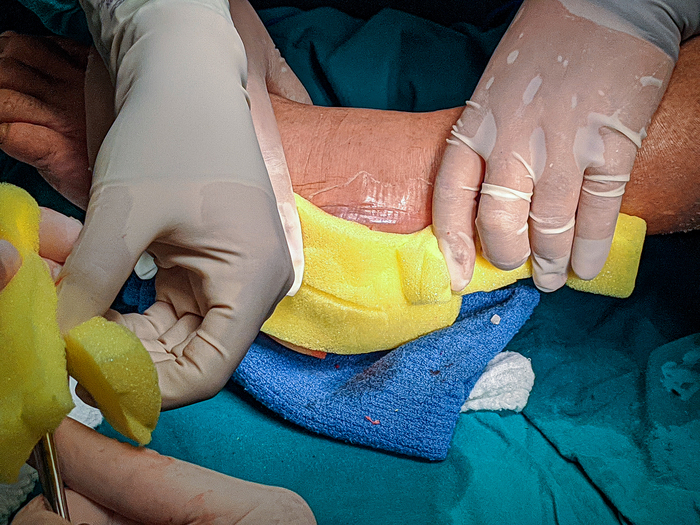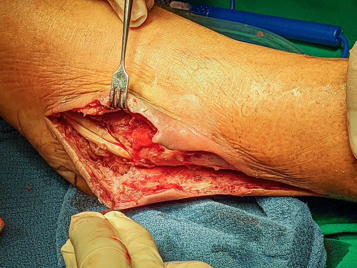 Достатосно красная (значит чистая) рана, чистые, но не шибко живые сухожилия (да, сосудов в них считай нет, верйвка и есть верёвка), немного ишемизированный лоскут кожи, за который пинцетом держится хирург, вокруг слегка отслоившийся эпидермис с кожи ввиду влажности и воспаления, и след от трубки на стопе.