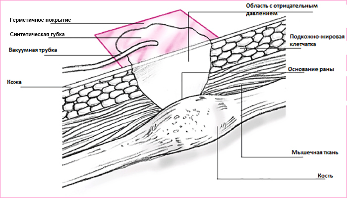 Терапия ран под отрицательным давлением (NPWT, вакуум-терапия ран, VAC-терапия) является широко используемым методом для очищения и способствования грануляции тканей и, таким образом, ускоряет процесс заживления.