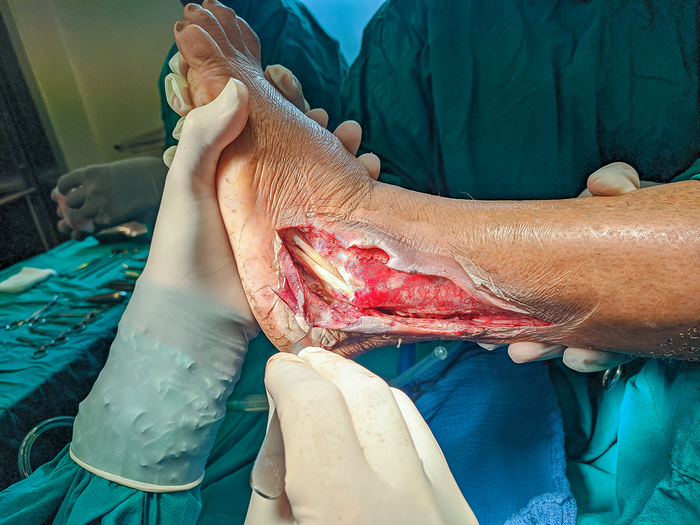 Вид ранки перед закрытием повязкой ("провода" это сухожилия):