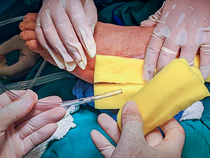 Подключаем к вакууму для проверки на утечки и погружаем конечность в гипсовую лонгету - иммобилизация уменьшает болезненость в ране и распространение инфекции по тканям.