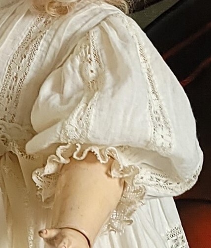 Платье. Вот тут мне пришлось нелегко. Полотна с нужной отделкой долго собирались вручную из хлопкового батиста, шитья и кружевной прошвы: