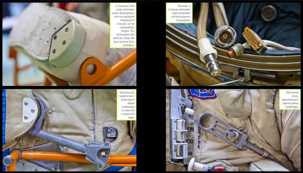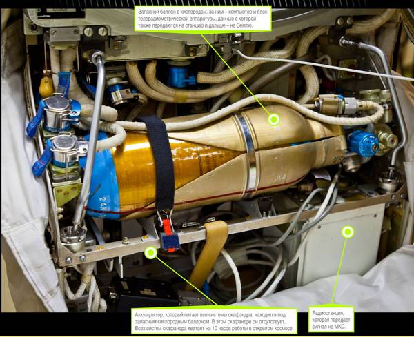 Пока космонавт находится в специальном шлюзе в скафандре и готовится к выходу в открытый космос, через эти клапаны он подключен к бортовым системам – воды и подачи кислорода для того, чтобы не расходовать системы жизнеобеспечения скафандра до выхода в открытый космос. Электричество поступает через специальный фал, который находится в правой части скафандра. Там же располагается запасной кислородный шланг на тот случай, если после возвращения из открытого космоса объединенный разъем коммуникаций по какой-то причине откажет. При выходе в открытый космос космонавт отстыковывает эти разъемы и включает системы жизнеобеспечения скафандра.