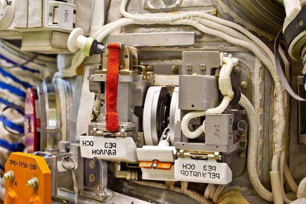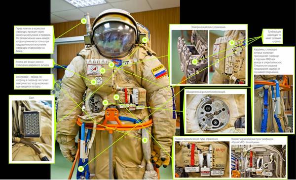 «Орлан МК» – это модификация скафандров, которые используются на МКС с 2009-го года. Вес скафандра – ни много ни мало – 120 кг. Буква «К» в названии означает, что в эту модель когда-то был впервые встроен компьютер. Он расположен в блоке радиотелеметрической аппаратуры. Блок собирает информацию с датчиков и передает ее на компьютер для анализа, который проверяет правильность работы всех систем жизнеобеспечения скафандра (температура, расход вентиляции, давление и т. д.). Если в работе систем скафандра возникают какие-то отклонения, на дисплее в передней части скафандра появится сообщение. Если космонавт не предпримет никаких действий, через некоторое время компьютер даст рекомендации, как действовать. А ведь когда-то при возникновении внештатных ситуаций космонавты могли рассчитывать только на себя. В нормальном режиме дисплей светится зеленым, при внештатной ситуации меняет подсветку на оранжевую.