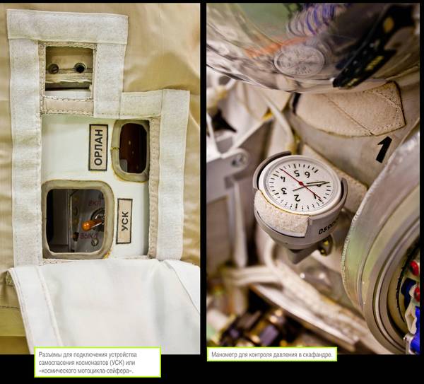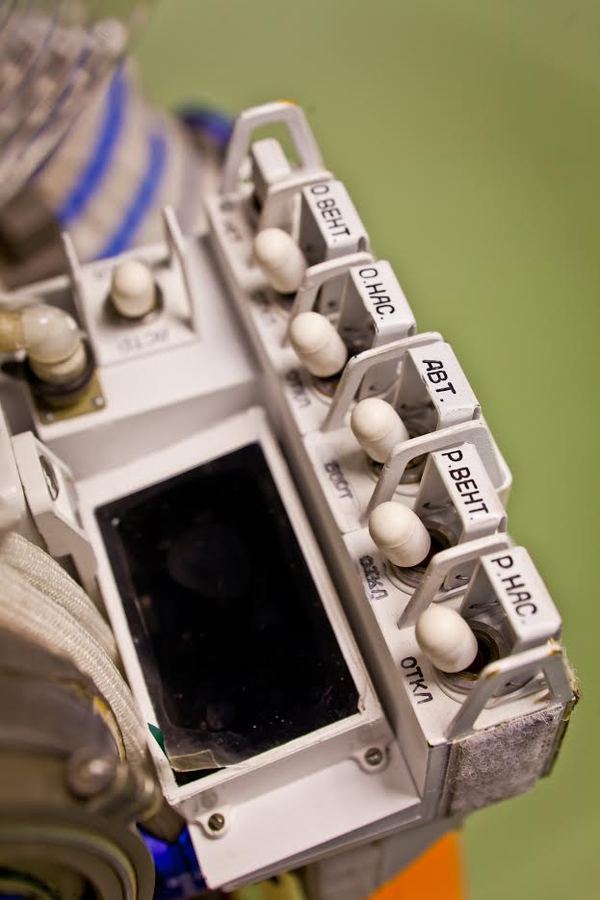 Тумблеры на пульте: слева – переключатель между основным и резервным баллонами с кислородом, справа – основной и резервный регуляторы давления в скафандре, в центре – кран регулирования температуры воды в костюме водяного охлаждения. На ручке имеется тумблер красного цвета, с помощью которого можно включить или отключить сублиматор (при выходе из шлюза в открытый космос, а также после возвращения на борт). Слева наверху – ручка инжектора и аварийной кислородной подачи. Если по какой-то причине в скафандре пропало электропитание, и электрический пульт перестал работать, то с помощь этой ручки космонавт может включить инжектор для продолжения вентиляции. Инжектор– специальное устройство, в которое при отсутствии электричества начинает поступать кислород из баллонов, при этом продолжает работать вся система вентиляции. Если в скафандре по какой-то причине начало снижаться давление и автоматический регулятор давления с утечкой не справляется, то с помощью этой же ручки космонавт может увеличить подачу кислорода в скафандр до 25 литров.