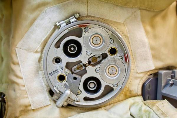 Предохранительный клапан находится на правом боку скафандра. Если давление в скафандре начнет повышаться, например, из-за лопнувшей кислородной трубки, то через этот клапан лишний кислород будет выводиться наружу. Когда скафандр надувается до нормального давления – клапан открыт. В скафандре две герметичных оболочки, и при нормальном давлении нагружается наружная оболочка. Если вдруг наружная оболочка будет повреждена, то клапан для сохранения давления закроется автоматически. При этом начнет работать резервная оболочка. Дублированная герметичная оболочка применяется только в российских скафандрах.