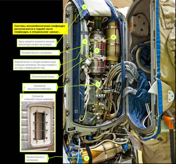 Сублиматор находится в задней части скафандра и располагается прямо под поглотительным патроном. С внешней стороны «ранца» сублиматор выглядит как «окно с сеткой». Это окошко представляет собой сложную металлокерамическую пористую конструкцию. Вода проходит через эту пористую поверхность под давлением, которое возникает внутри скафандра. Проходя через металлокерамические поры, вода замерзает (вода в вакууме превращается в лед). Затем лед сублимирует наружу (в вакууме лед превращается в газ). Схема работы сублиматора похожа на круговорот воды: теплая вода и теплый газ, попадая в сублиматор, растапливают образовавшийся там лед. Затем в сублиматор поступает новая порция воды из водяного бака и снова образует лед. Лед необходим для охлаждения воды, которая циркулирует в костюме водяного охлаждения. Костюм водяного охлаждения – это специальный внутренний костюм, который надевается отдельно под скафандр. Он состоит из тонких трубочек, по которым циркулирует вода. С помощью этого костюма космонавт может поддерживать комфортную для себя температуру.