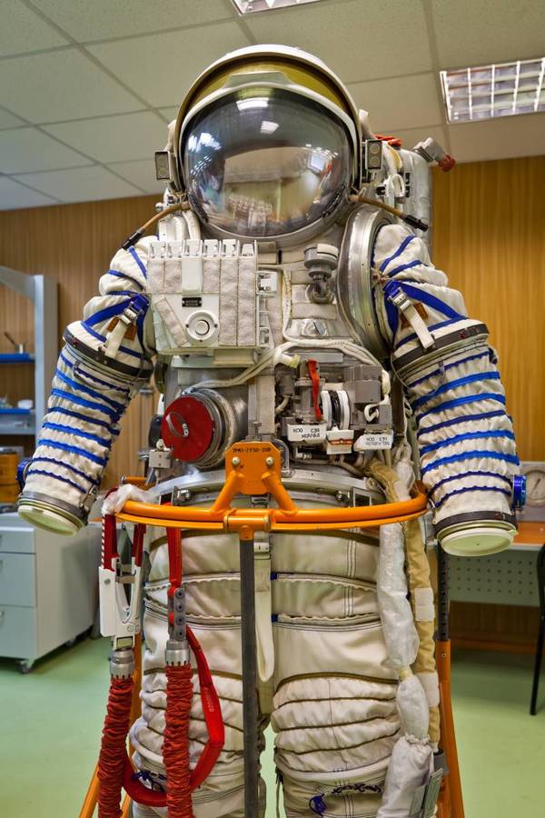 Новейшая модель скафандра «Орлан МКС», которая в скором времени будет поставлена на МКС на замену «Орлану МК». На фото Вы видите силовой каркас, без верхней одежды. В скафандре впервые в мире применена система автоматического терморегулирования. Если в текущей модели «Орлан МК» космонавт может регулировать температуру только вручную– с помощью тумблера на пневмогидравлическом пульте – то теперь система может самостоятельно определять уровень энергозатрат космонавта и регулировать температуру воды в костюме водяного охлаждения. В костюм встроены специальные клапаны, которые в зависимости от требуемой температуры пускают воду в сублиматор или мимо него.