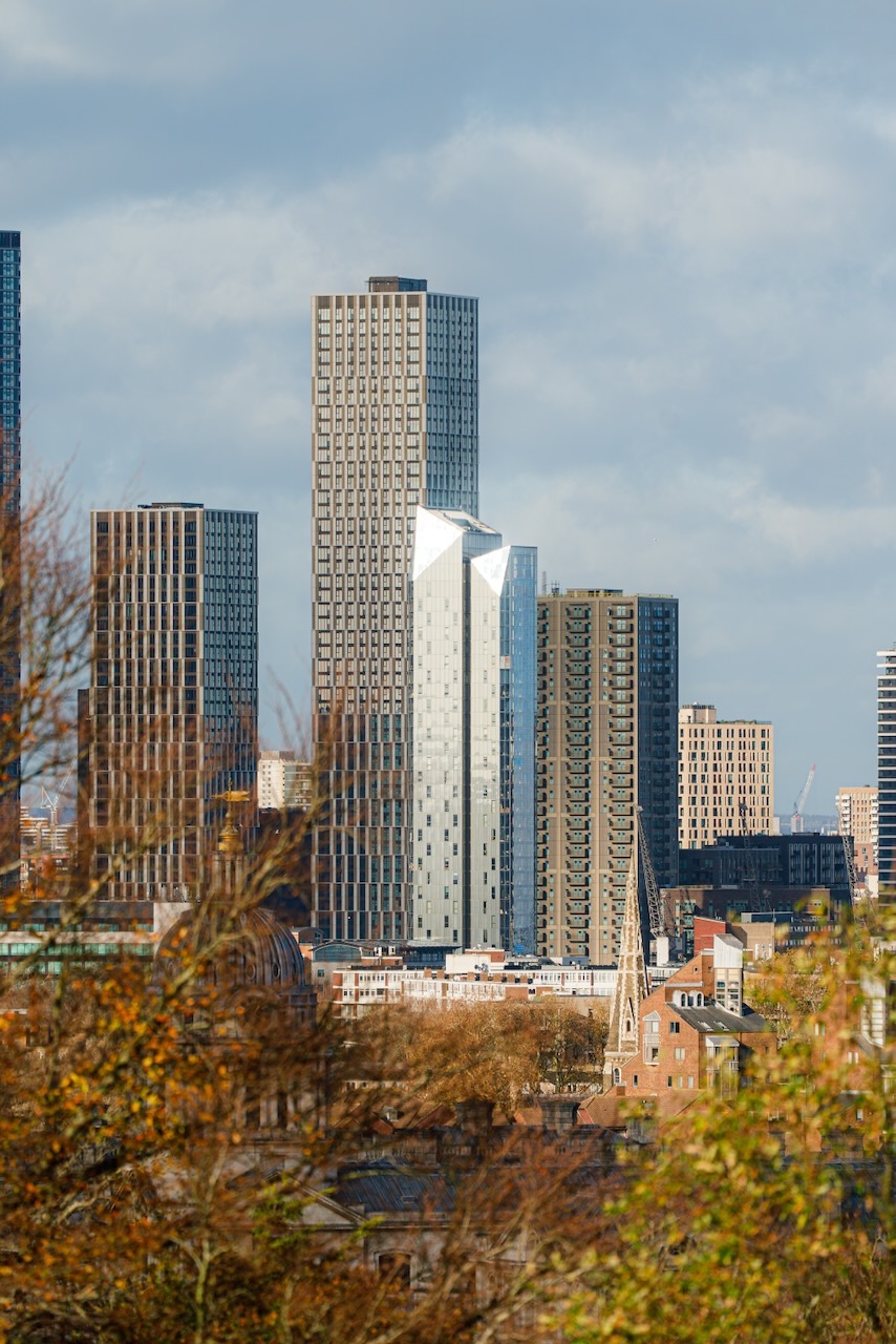 Вид на окраину Canary Wharf с набережной в районе Three Colt Street: