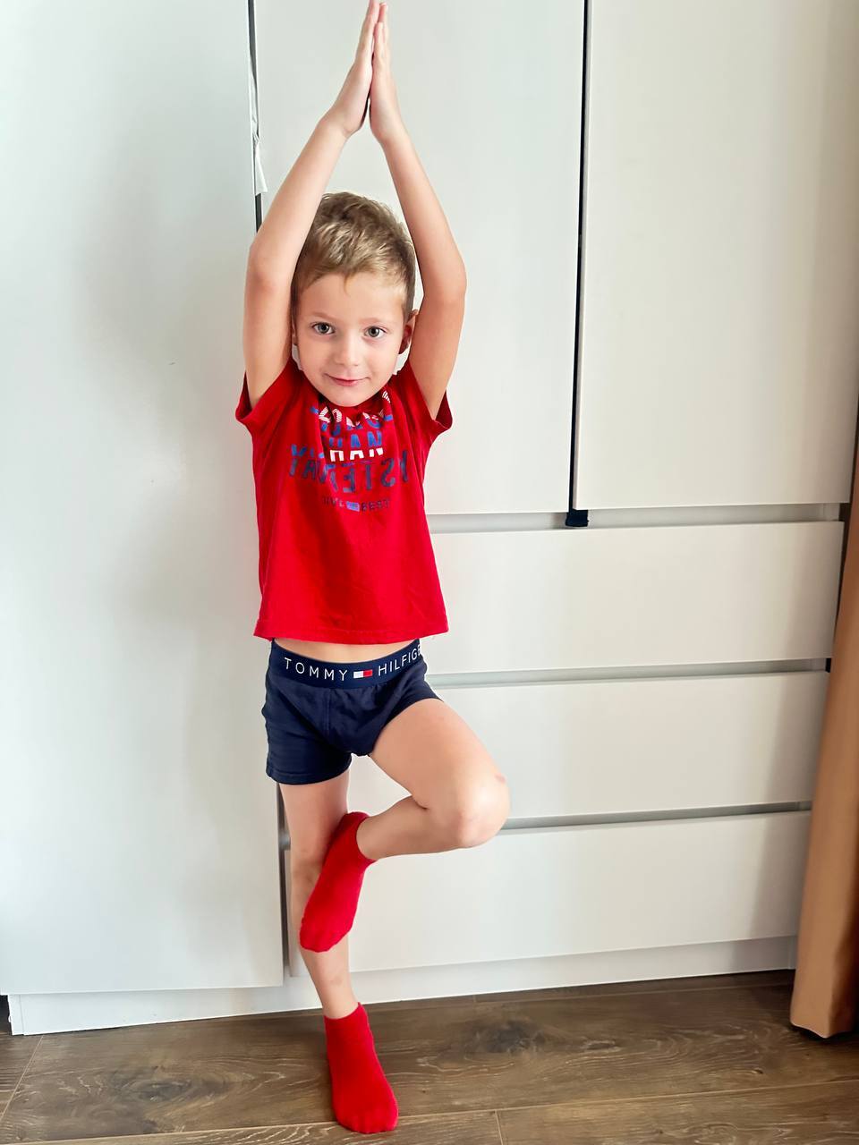 Мальчишки, конечно, интересуются, чем я занимаюсь, кое-что повторяют. Вот здесь Алексей выполняет Врикшасану – это поза дерева, которая помогает развивать чувство баланса, укреплять мышцы ног, спины и живота, улучшать осанку.