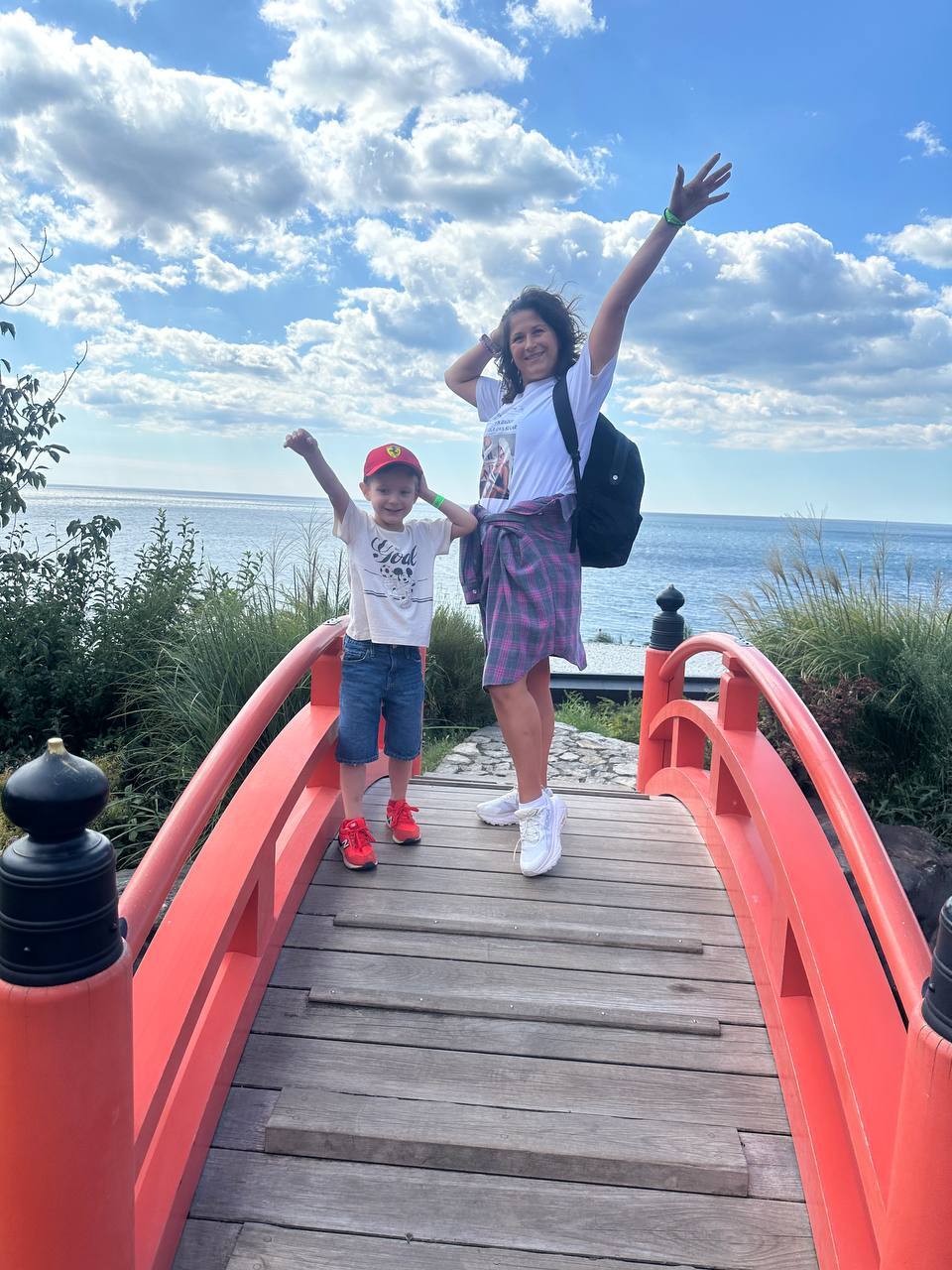 Мы пришли на парящий мост – такой есть, например, в Москве, в парке Зарядье. Мост прозрачный, через перила видно море, и кажется, что ты находишься в воздухе. Очень красиво!
