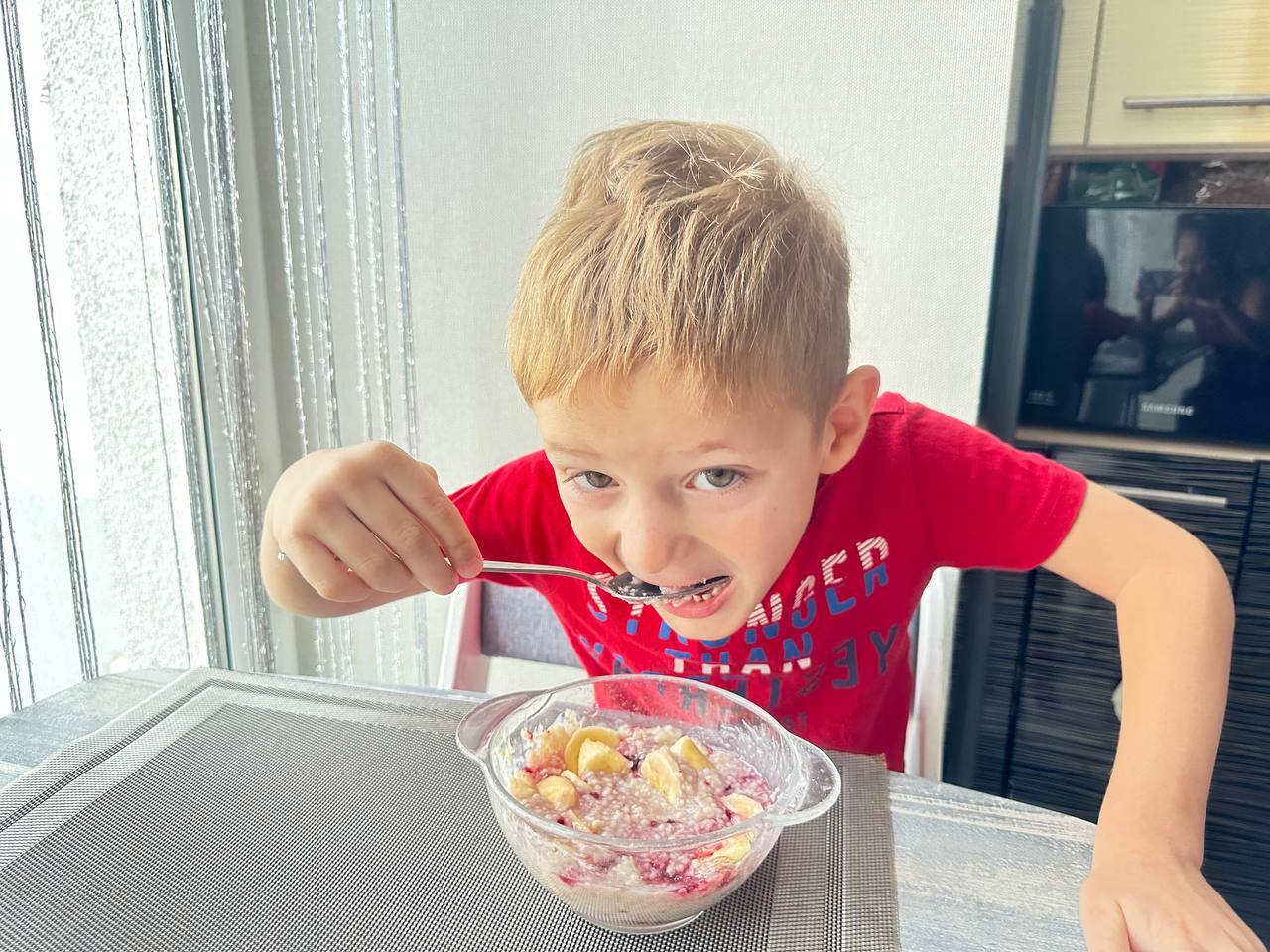 Позавтракали перед поездкой. Лёша ест овсяную кашу с бананами и малиной. Свежие фрукты обязательны в нашем рационе, ведь детям нужны витамины. А еще каша – самый правильный завтрак.