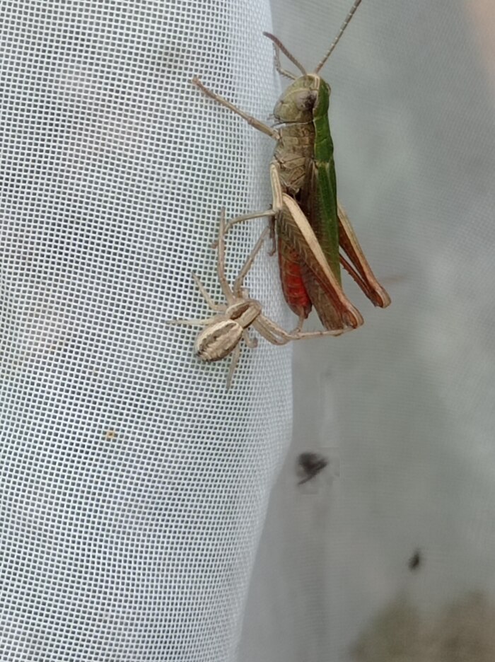 Рис. 8. Какой-то паук-краб пытается съесть какого-то скачка из подсемейства короткоусых прямокрылых... Удачи, бро.
