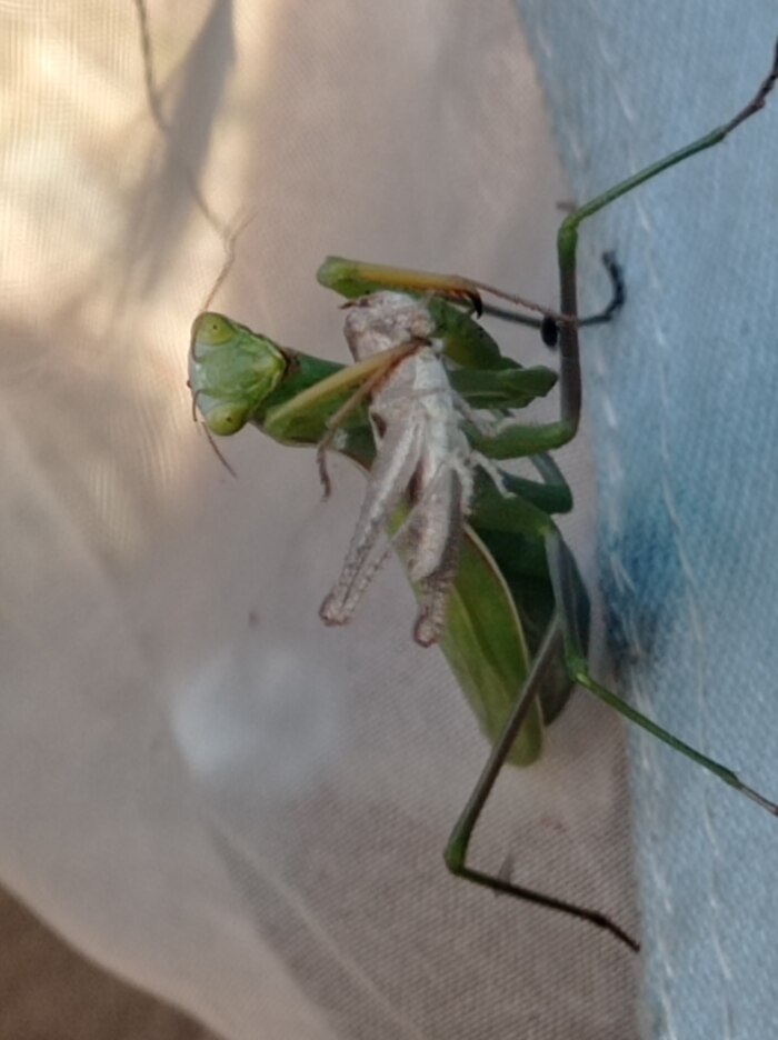Рис. 9. Самка богомола приступает к трапезе. С нежностью смотрит на конька. Конёк уже никуда не смотрит, у него почти откусили голову.