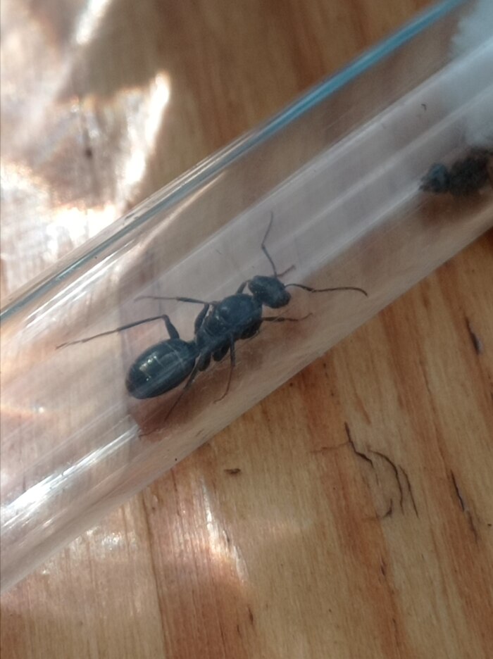 Рис. 5. Добрая и справедливая королева-мать, вышедшая на защиту своих дочерей от набега амазонок. Это степной бегунок, муравей-фаэтончик. Я скрепя сердцем забрал её и несколько спасшихся рабочих к себе домой. Строю формикарий для них. Весёлые существа. Всё равно им в этом специальной муравьиной операции не выжить, к тому-же колонию они обосновали на сельской дороге, дурачки.