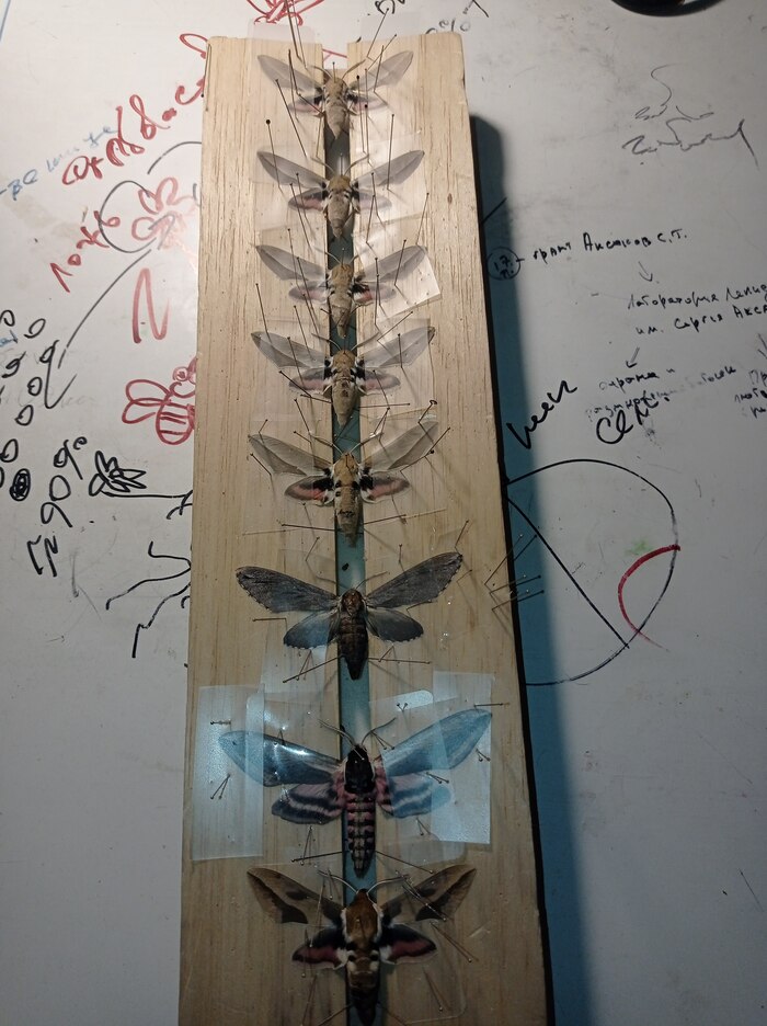 Рис. 16. Бражники на расправилке. Тот самый сиреневый - второй снизу.