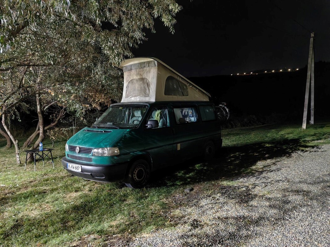 В этой поездке решил ночевать только в кемпингах, но моим планам не суждено было сбыться, так как в первом же кемпинге вместо радушного гостеприимства оказался замок на дверях и не отвечающий телефон хозяина. Ну ничего, быстро осмотрелся и нашёл хорошее место в удалении от дороги и источник питьевой воды. Пока решал вопросы с ночёвкой уже наступила ночь, а хотелось поесть приличной еды и по возможности найти интернет. Всё это оказалось рядом в кафе. Пока готовилась еда, общались с владельцем о разном. Жаловался, что в этом году очень мало туристов из России.