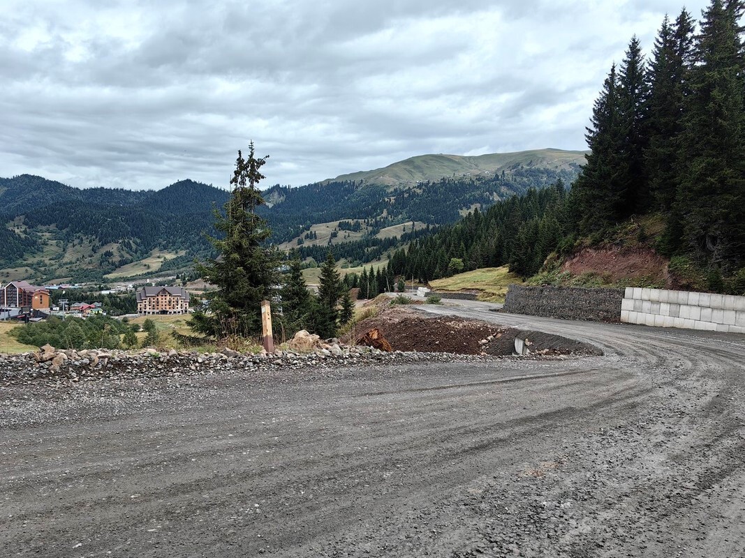 Температура упала до 10 градусов и дорога местами перешла в грунтовую. Там же находятся подъёмники на горнолыжный курорт Годердзи. Зимой видимо народа тут очень много, а сейчас совсем нет.