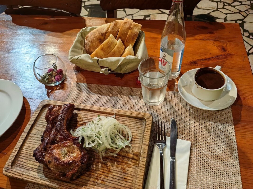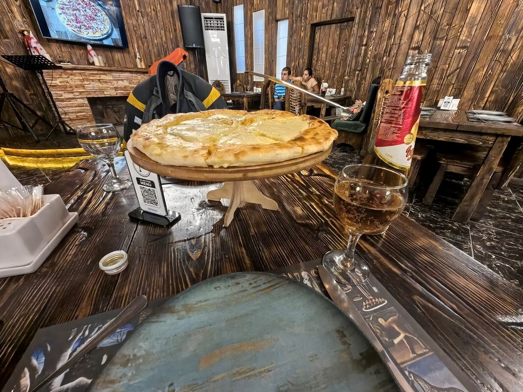 Погулял, посмотрел красоты и двинулся дальше. Арку «Дружба народов» проехал мимо, слишком много людей, ларьков со всякими чачами/мёдами. Не люблю такие места. За посёлком Квемо Млета есть хороший ресторанчик Млета (42.427040, 44.515818), где прекрасно пообедал хинкалями.