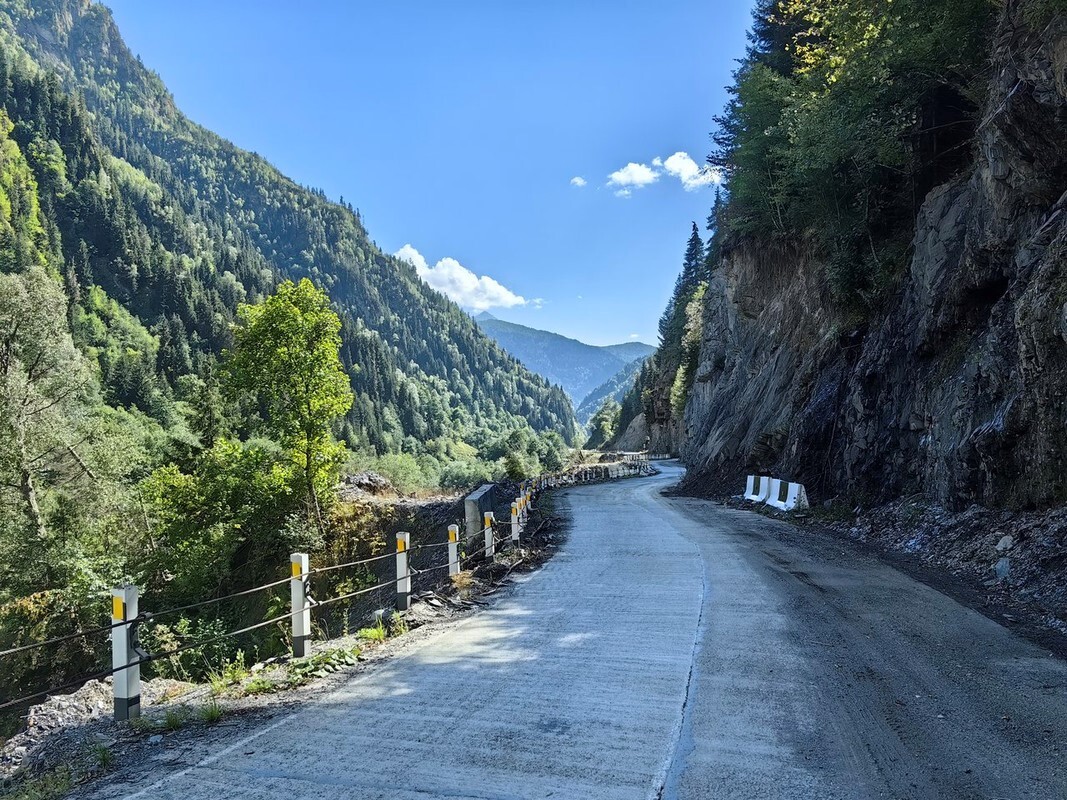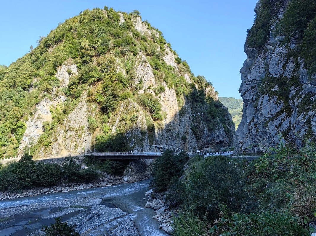 Приготовил завтрак, поел, собрался и двинулся дальше. В небольших городках типа Боржоми центр выложен брущаткой, улочки маленькие, уютные. Народ никуда не спешит, вот совсем. Они точно поняли жизнь :) До Батуми идёт две дороги: основная от Тбилиси (скоростная магистраль) и Трансаджарская дорога, которая если верить истории до советской России была горной тропкой. Сейчас большая её часть — идеальный асфальт. Правда нужно держать ухо в остро, так как за очередным поворотом на дороге могут лежать камни после очередного дождя упавшие с вершин.