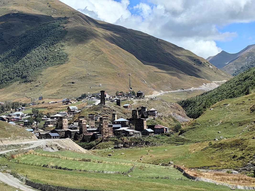 В отличии от вчерашнего дня с погодой повезло. Дождей не было, грунт подсох и ехать легко. В горах погода решает: если дожди, то вершин не видно и ехать зябко, а когда солнышко, то душа поёт! Добрался до посёлка Ушгули. Примечателен он своими каменными башнями и тем, что это самое высокогорное поселение Европы (2200 м). Пообедал в местном кафе и двинул дальше.