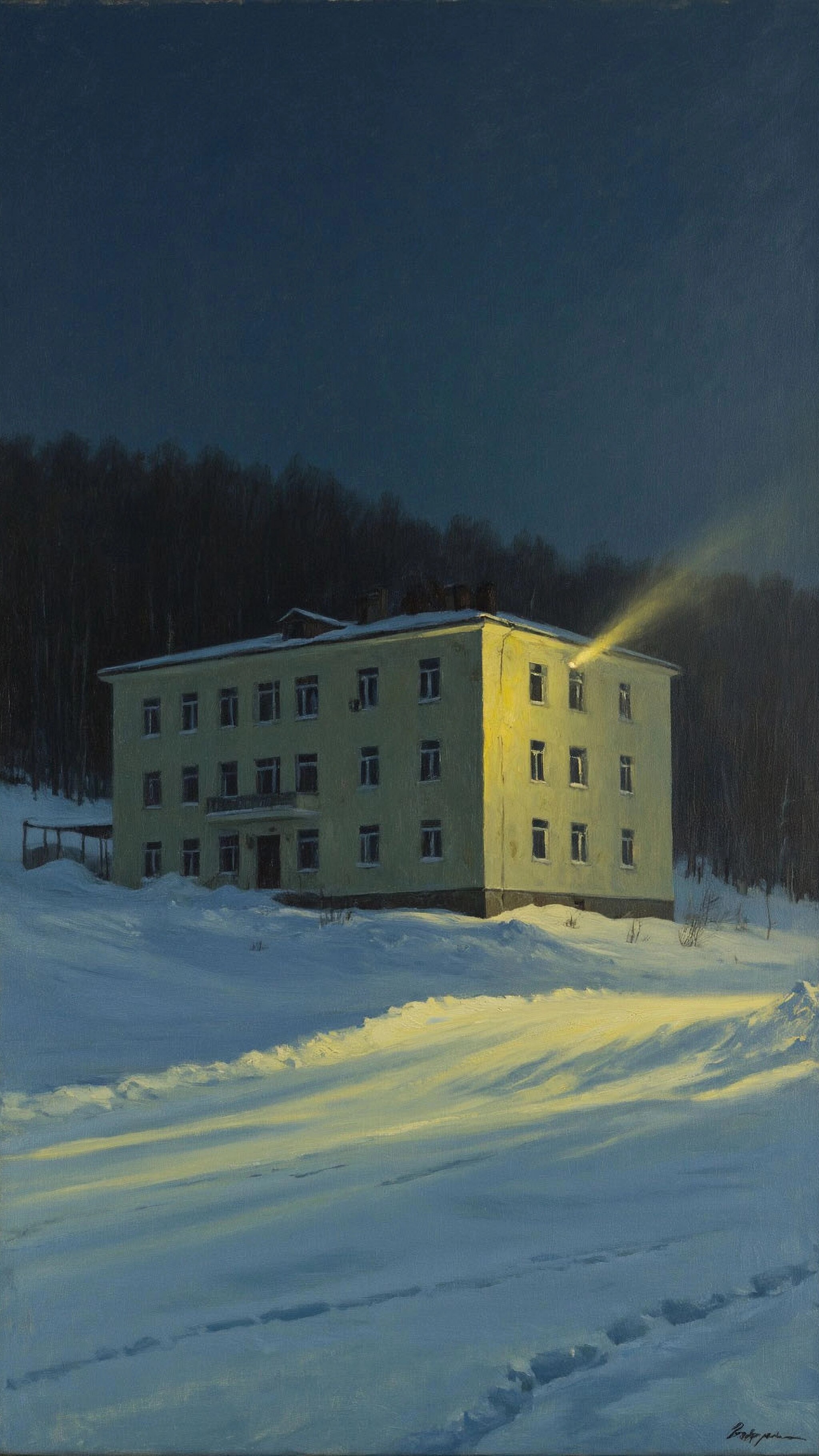 пейзаж ночной зимний,метель, одинокий отель в горах, живопись, динамика, снег, метель, тусклый желтый фанарь, старый российский район, старый, СССР, девяностые года, винтаж, игра света и тени, свет в окне, рисунок маслом, панорамная композиция, экспозиция