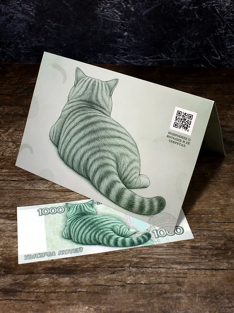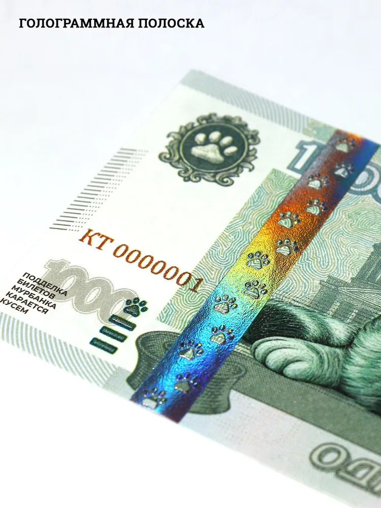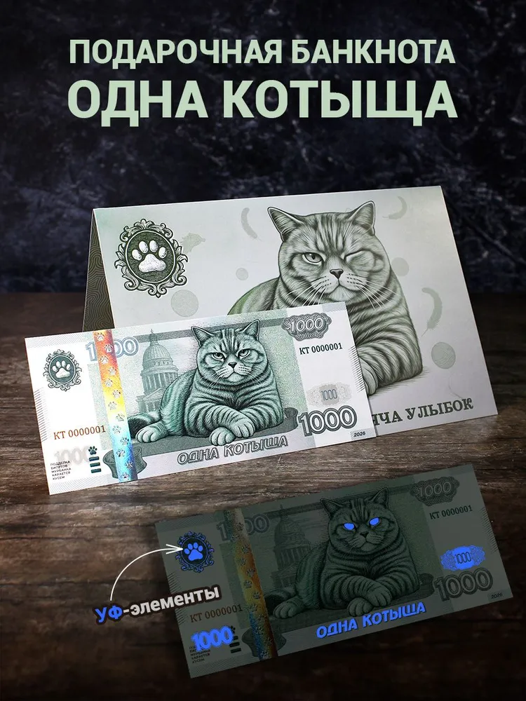 Подарочная сувенирная банкнота "Одна Котыща" с УФ-элементами, видимыми в ультрафиолетовом освещении.