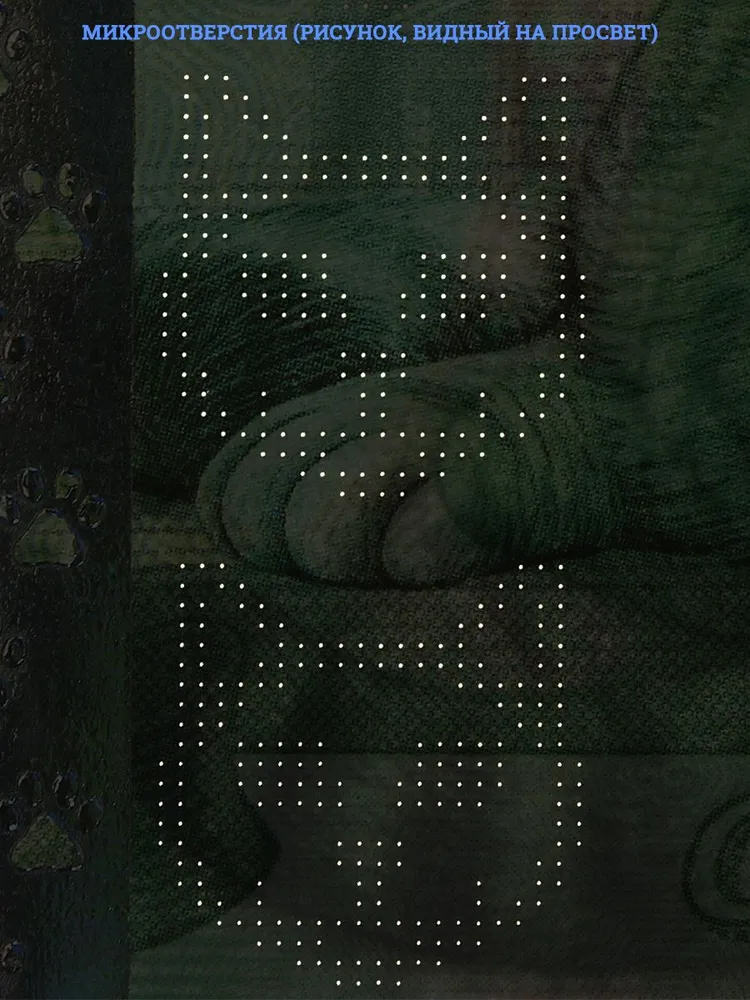 Банкнота обладает защитным дизайном с индивидуальным оформлением: рисунки, проявляющиеся в УФ свечении, микроотверстия с видным на просвет рисунком, тактильные метки, металлизированные элементы - голограммные полоски, бумага с водными знаками, а также индивидуальная нумерация.