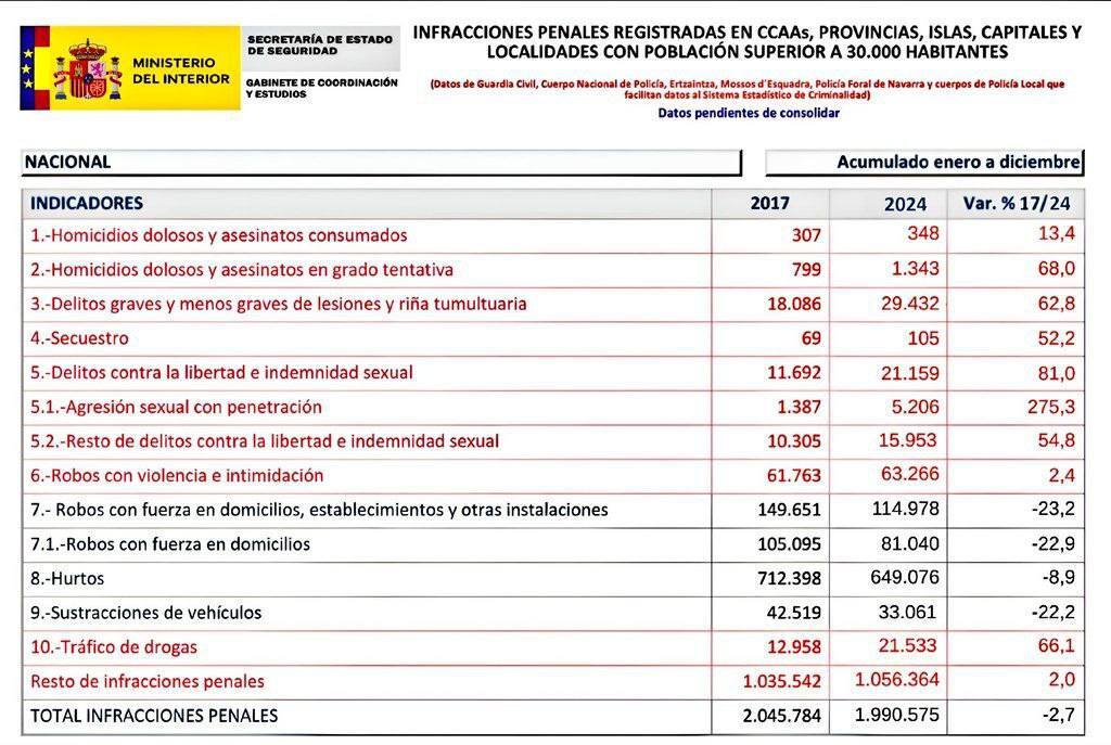 В Испании с 2017 по 2024 гг. существенно возросли показатели криминальной статистики: