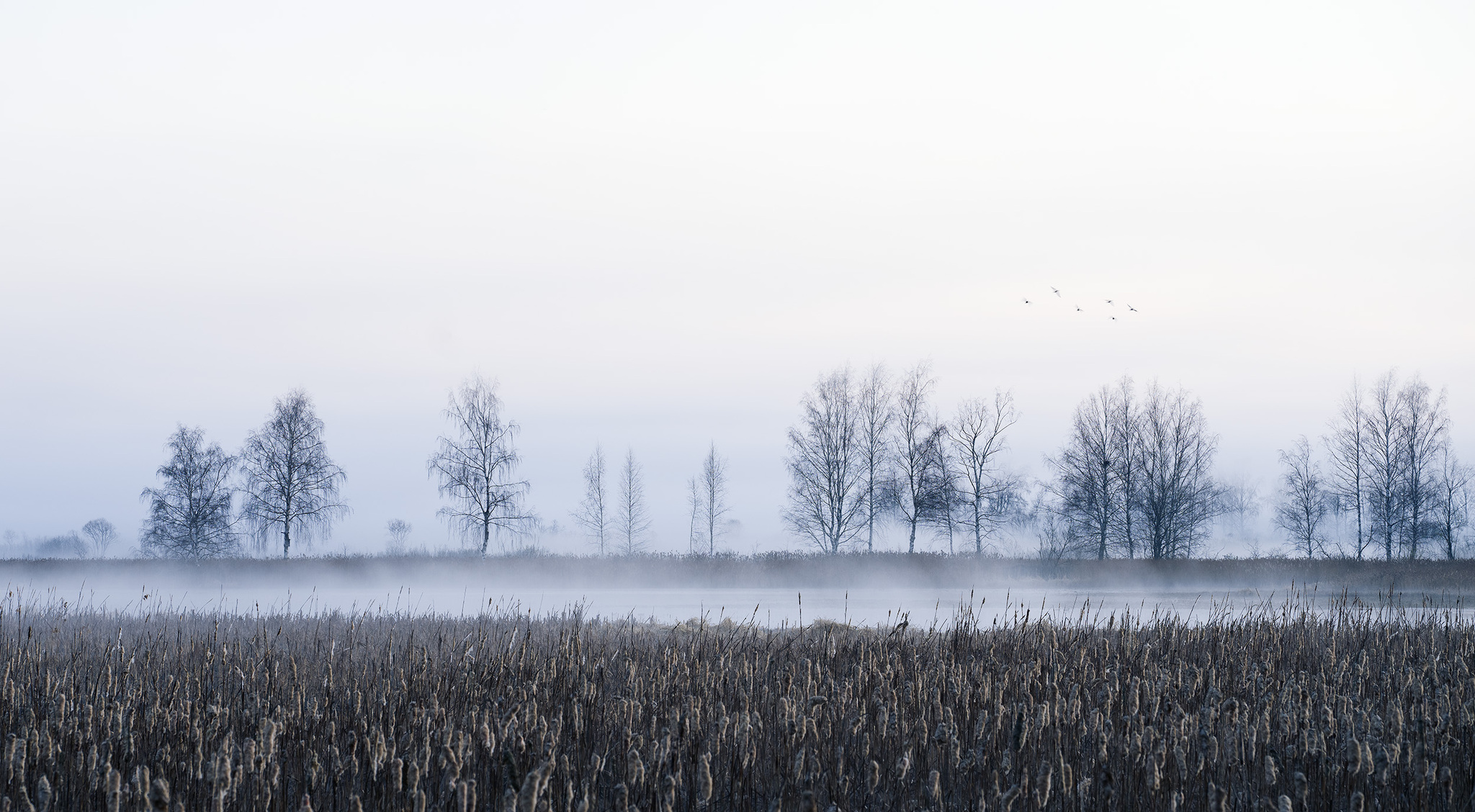 Восход Солнца над Рыбинским водохранилищем и рогоз