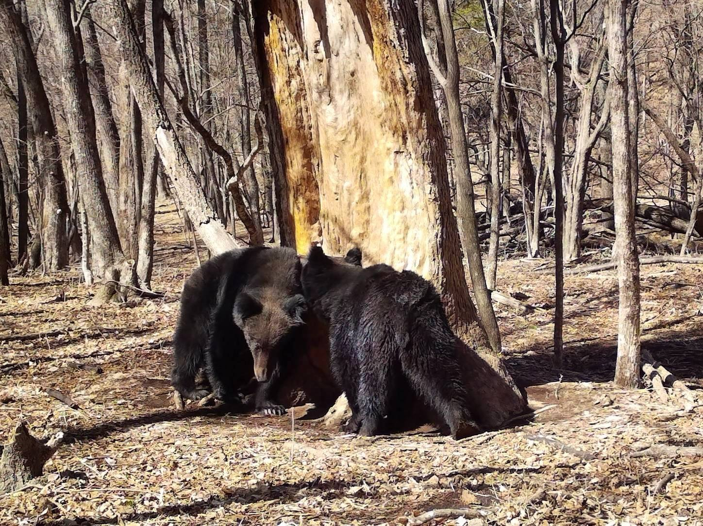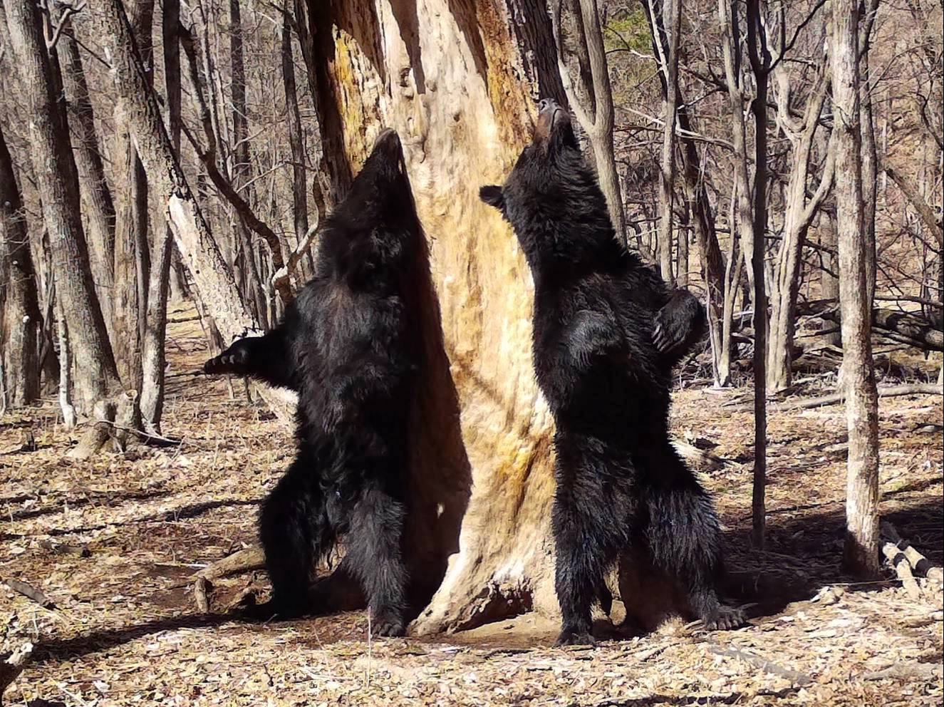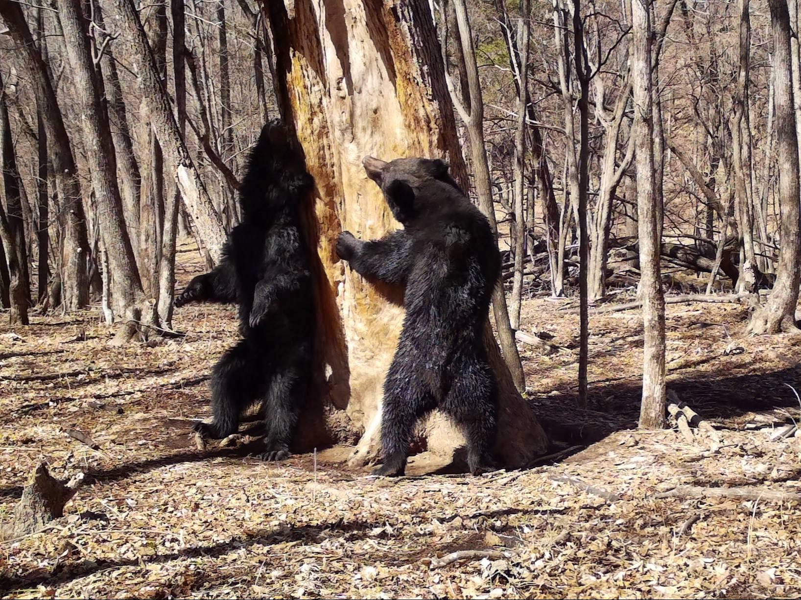 На фотоловушку национального парка «Земля леопарда» в Приморском крае попали два самца бурого медведя третьего-четвёртого года жизни у меточного дерева, начавшего свой рост ещё два века назад. Медведи в кадре уже отделились от матери и живут самостоятельной жизнью, но ещё какое-то время держатся вместе.