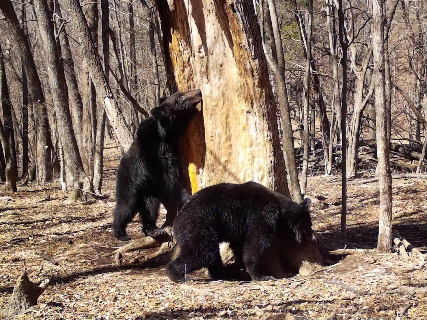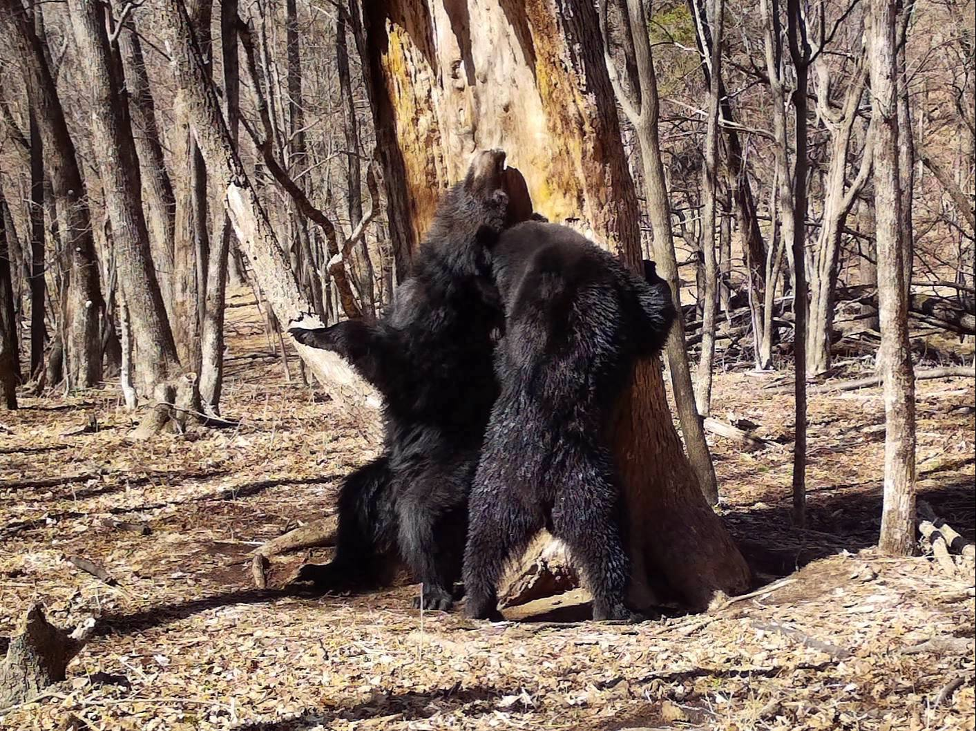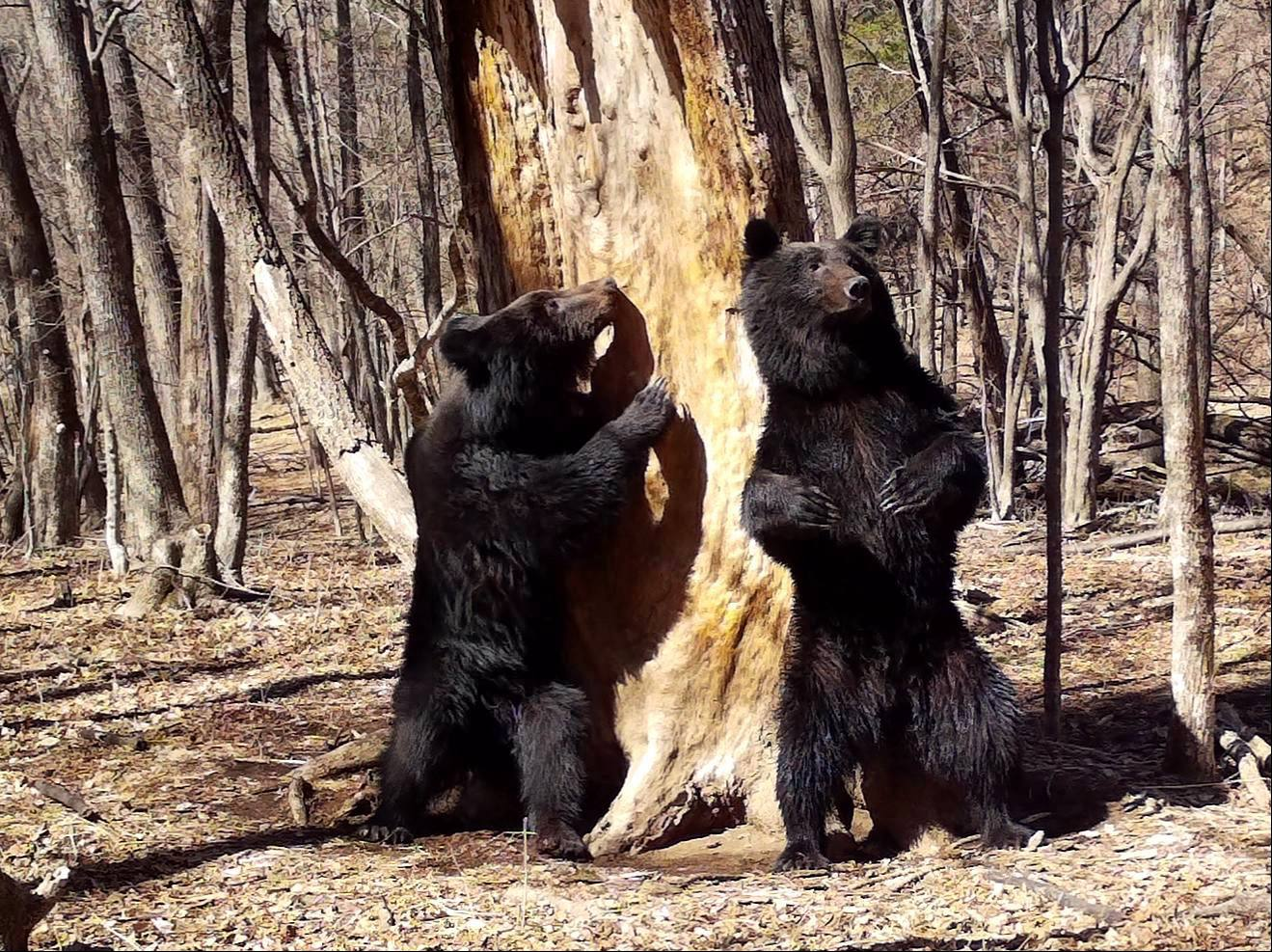 На фотоловушку национального парка «Земля леопарда» в Приморском крае попали два самца бурого медведя третьего-четвёртого года жизни у меточного дерева, начавшего свой рост ещё два века назад. Медведи в кадре уже отделились от матери и живут самостоятельной жизнью, но ещё какое-то время держатся вместе.
