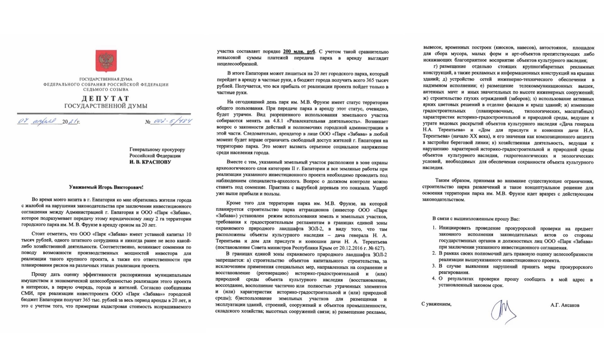 Мы просим надзорное ведомство дать оценку действиям администрации Евпатории, которая передает исторический парк частной фирме-однодневке.