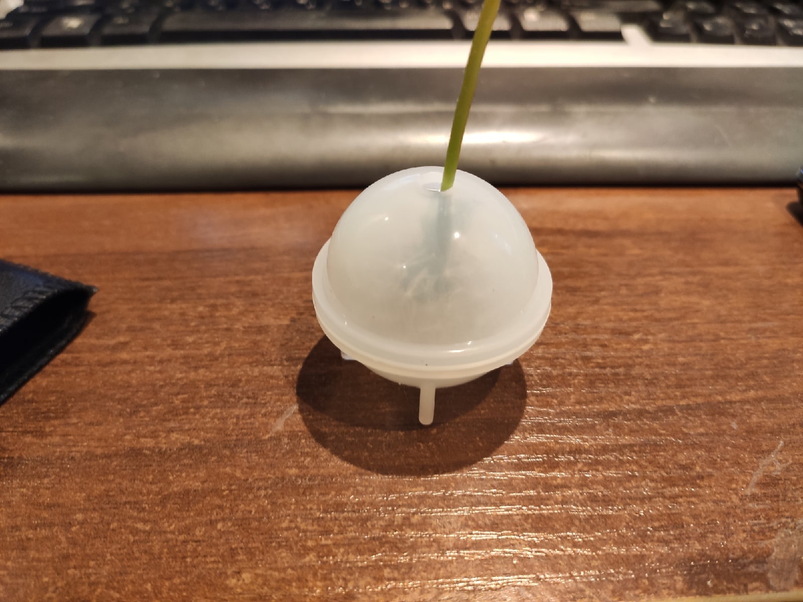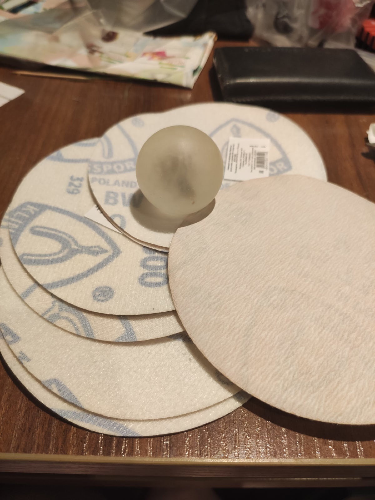 Сошлифовывал вышеназванные части гравером, дальше уже саму сферу шлифовал вручную наждачкой. Шлифовал по мокрому, потому как пыль эпоксидной смолы не слишком полезная штука, ну и так наждачная бумага меньше забивается. Начинал с 400 наждачки и до 2000. Также не забываем пользоваться респиратором. Получаем в итоге вот такую матовую сферу.