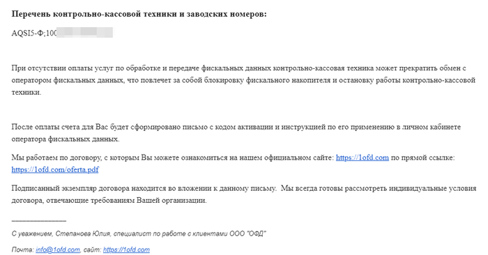 Вспомнил, что ОФД у нас от СБИС и тариф почековый, а не срочный договор. Проконсультировался в чате СБИС, и всё встало на места: мошенники, иначе назвать нельзя. Рассчитывают на то, что ипешник забыл уже какой офд у него подключен. У нас касса c середины 18 года и я мучительно долго вспоминал как там и чего.