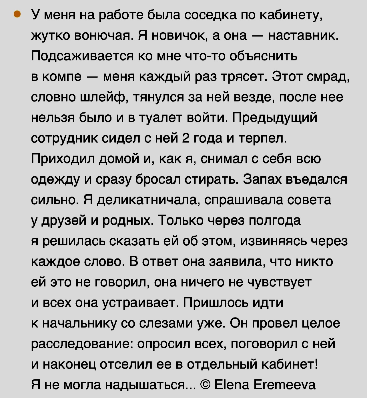 Мы сидели в опен-спейсе, и у нас был один жутко вонючий разраб, юное создание на тот момент только после универа, ооочень странный чел, подозреваю, что там что-то из аутического спектра, т.к. кроме вонизма у него еще были другие странные вещи в поведении. От него воняло так, что просто глаза слезились, и тошнота подкатывала. Когда он с утра приходил и снимал куртку, то весь кабинет прованивал наверное за 15 минут. Я сидела от него довольно далеко, и то до меня долетало, что там сидящие рядом с ним испытывали - я не знаю. Короче, мы ему тоже пытались намекать, он не понимал, но с кем-то поделился, что стирает одежду раз в месяц (и то не всегда): возит куда-то в ебеня области к родителям, а сам живет в общаге. Самое интересное ,что чисто визуально он сам не выглядел грязным, волосы чистые, все такое. Его прошлая команда разработки нам радостно сообщила, что они тоже помирали рядом с ним. Короче, у нас терпение кончилось довольно быстро, через месяца два максимум: мы прижали его тимлида и наставника по совместительству, мол, либо ты с ним беседуешь, либо ищи нам другой кабинет. И тимлид ему сказал: "Чувак, ты заебал, рядом с тобой дохнут мухи". Уж не знаю, как и где этот чел раздобыл "средства" для стирки, но рили, проблема ушла (хоть и не сразу), видимо, он стал возить одежду стирать чаще))