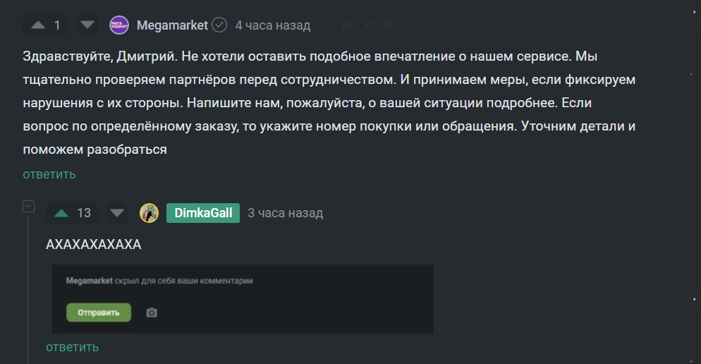 6867 Slart Официальный ответ 10 месяцев назад Я считаю, что это просто шедевр. #comment_337265272 @DimkaGall @Megamarket Официальный ответ Комментарии Скриншот Переписка Комментарии на Пикабу Картинка с текстом Мемы Мегамаркет Служба поддержки 223 52 8 6 3 Ещё 0