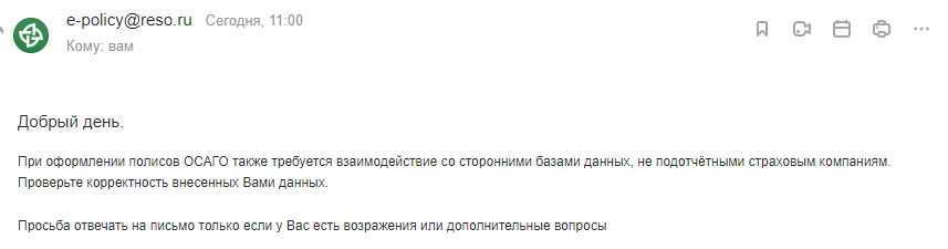 "Информируем о том, что представленные страхователем сведения не соответствуют информации, содержащейся в АИС ОСАГО (отсутствуют в ней)".