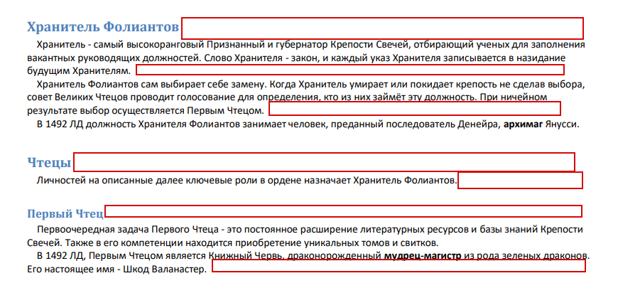 Важно оформить всё так, чтобы информация была легко читаемой. Читатель должен без труда понять что, как, почему и где находится. Помните, что именно здесь информацию будут искать чаще всего, особенно во время боевых сцен. Мастеру важно быстро разобраться во множестве факторов. Поэтому, пожалуйста, уделите должное внимание этому разделу.