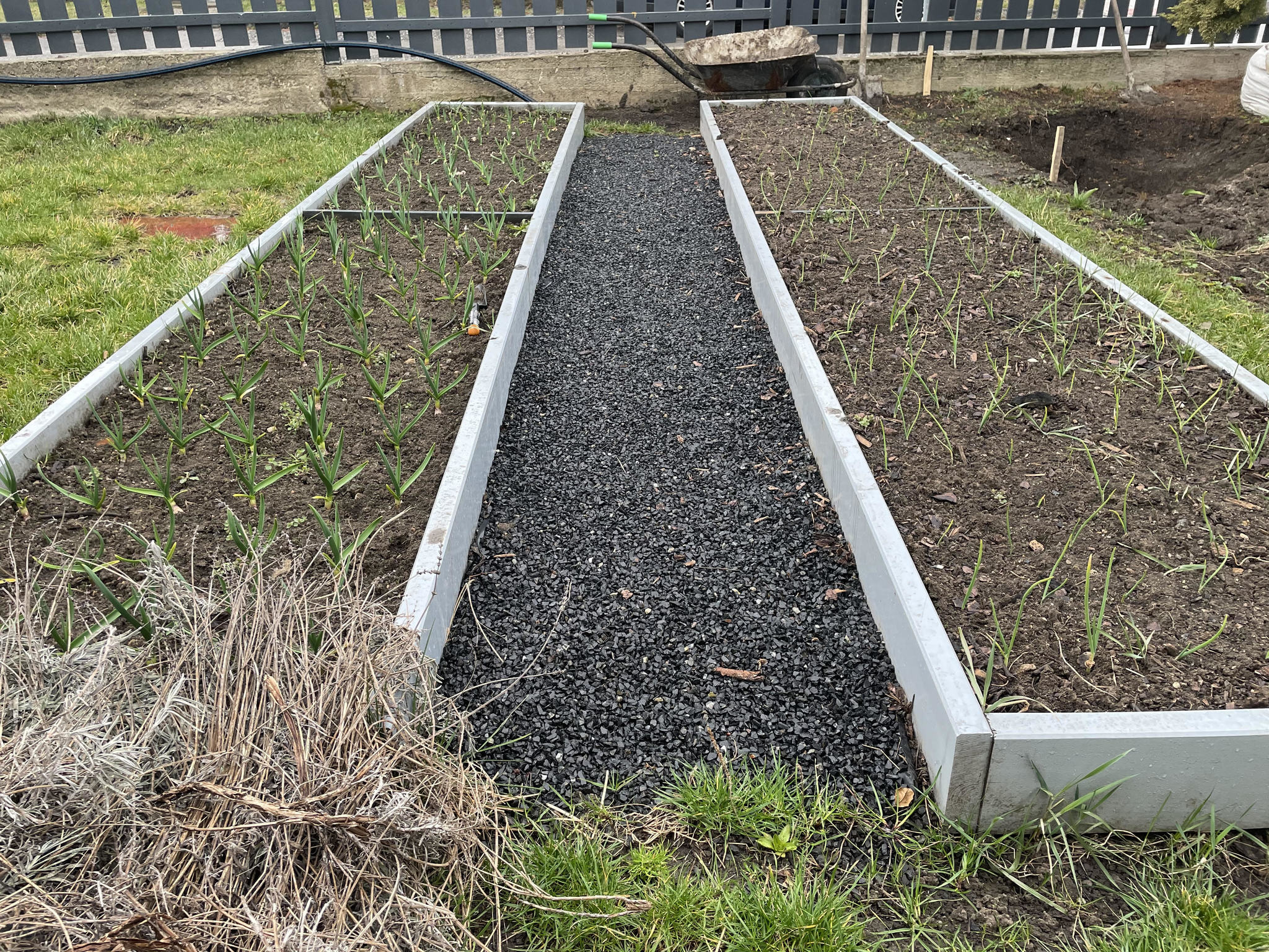 Плюс еще 3,5 гряды в конце огорода. Бордюры в 2 доски высотой были удобны для всех задач, предъявляемых к грядкам.