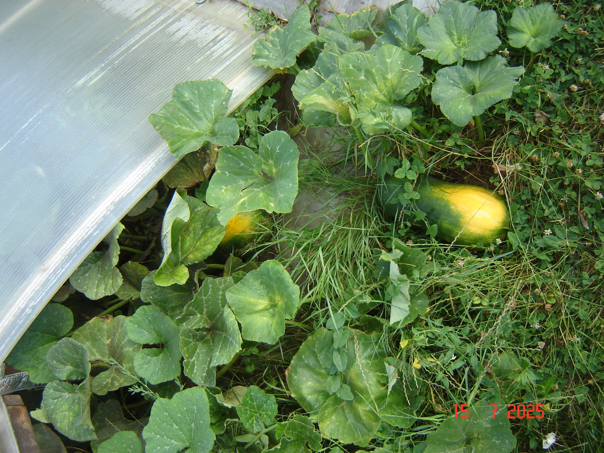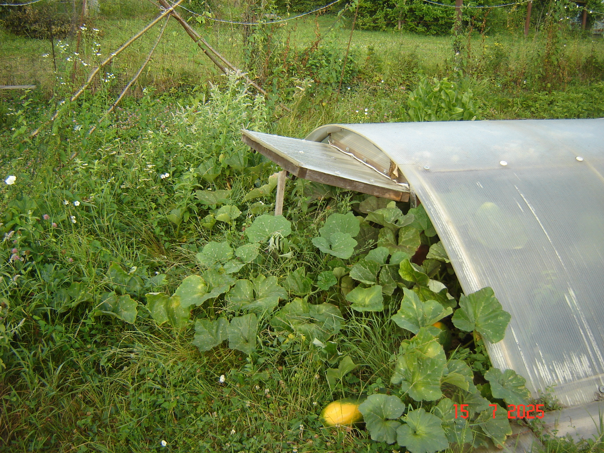 Этим летом заглубленная теплица отдана под тыквы, которые были посажены в начале марта. Я и боковины снял, чтобы она выбралась на улицу.