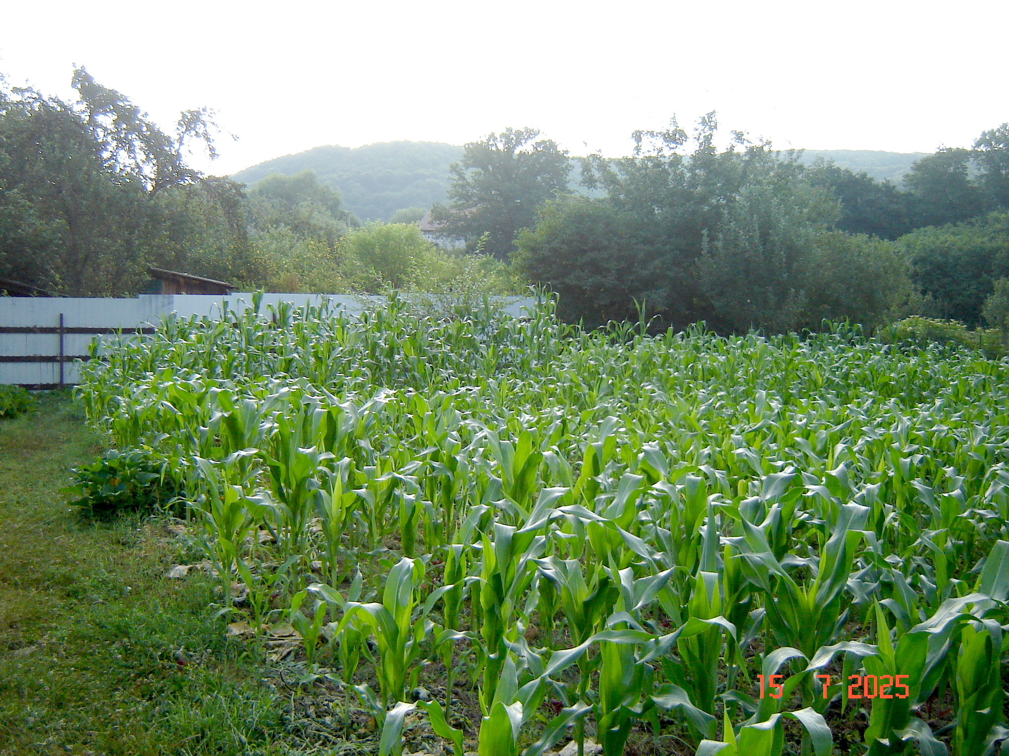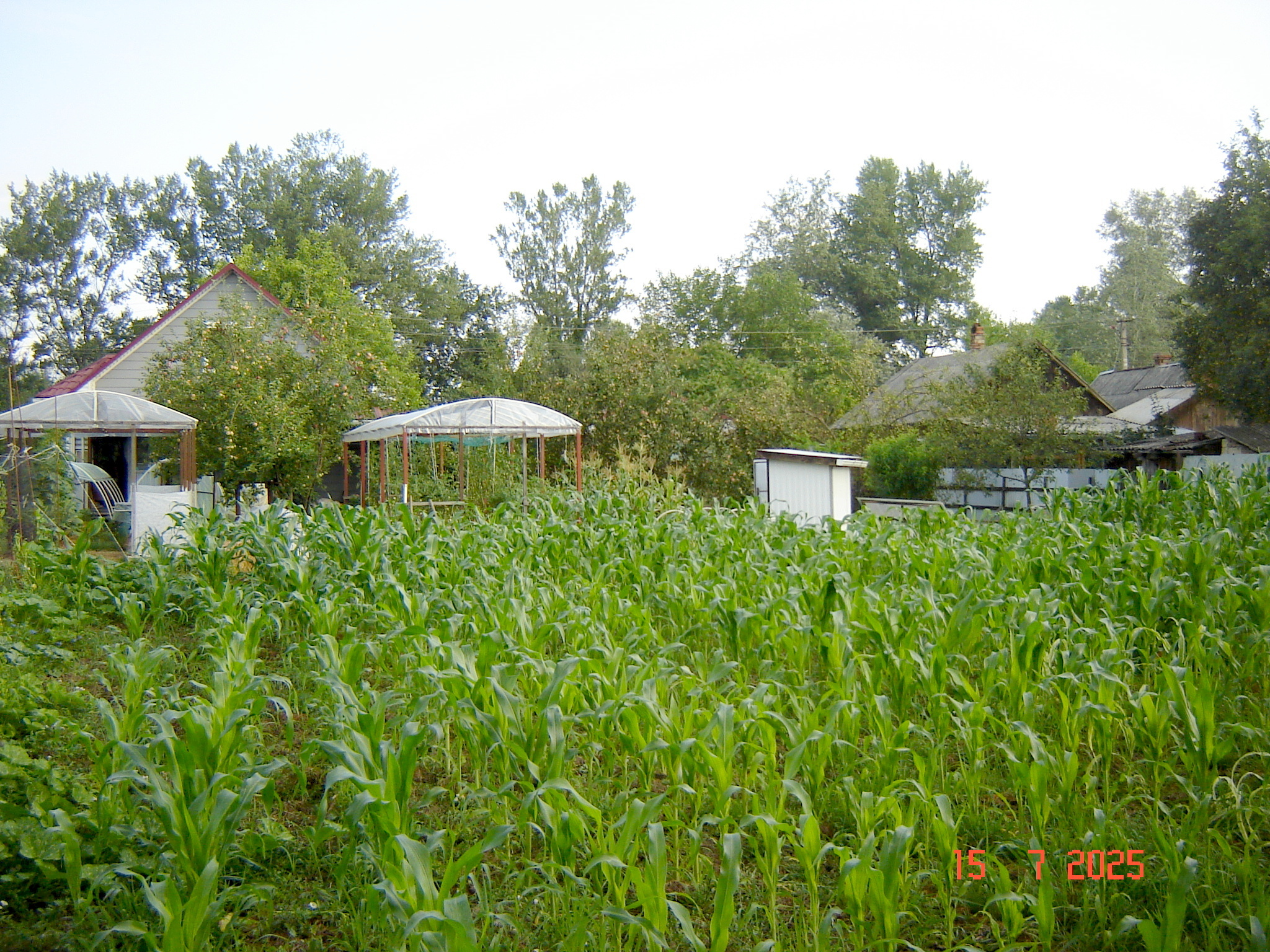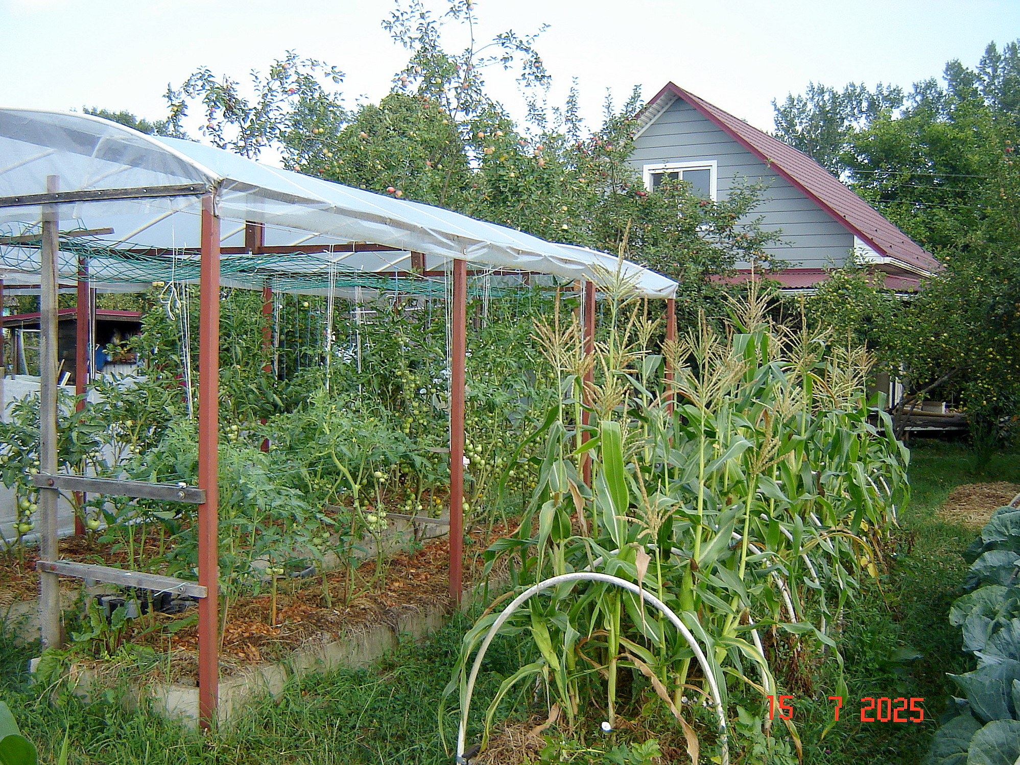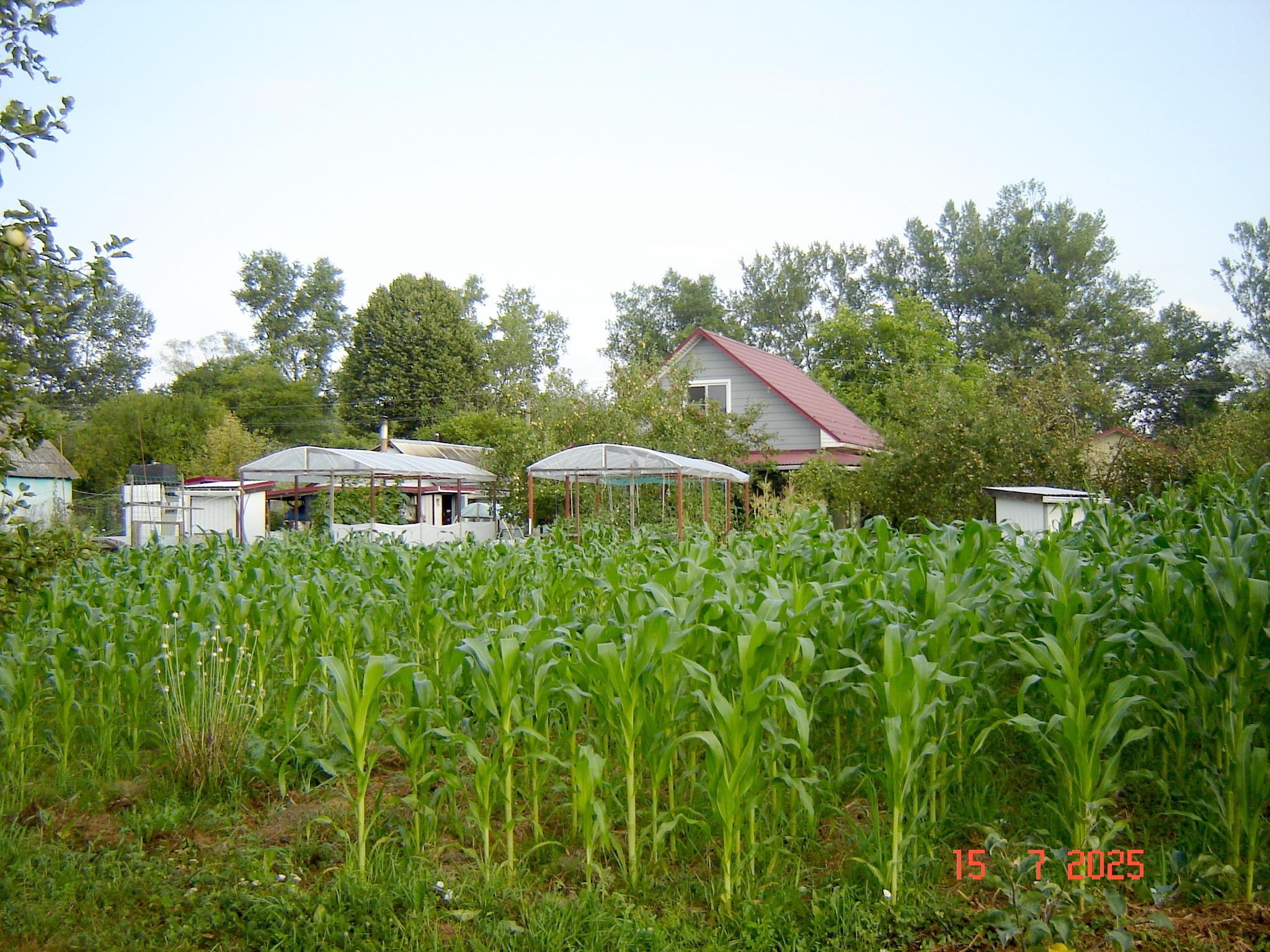 На грядке сладкая кукуруза и похоже уже почти готова, но еще не снимали.