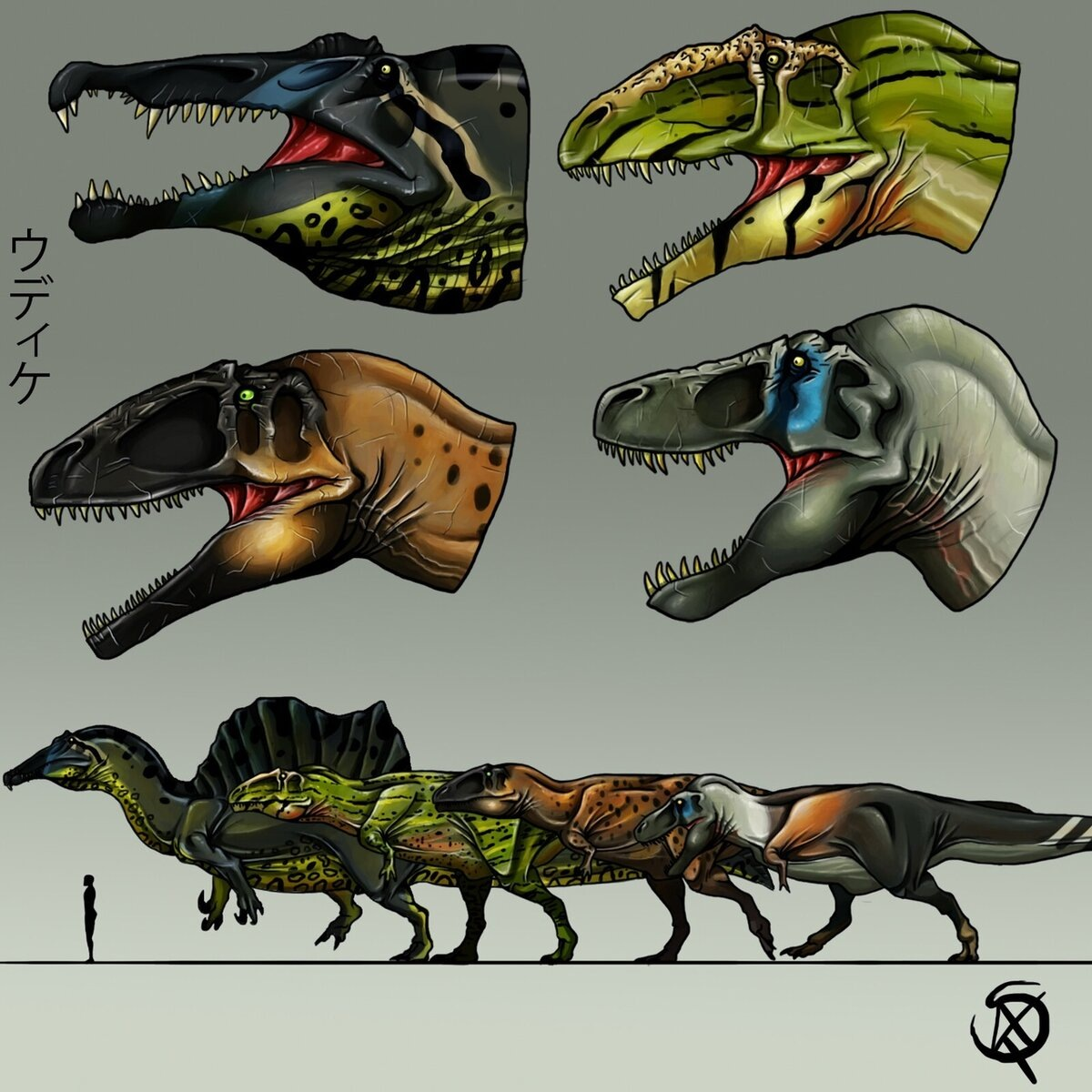 Сравнение некоторых крупнейших теропод. Слева направо: Спинозавр, гигантозавр, кархародонтозавр, тираннозавр.