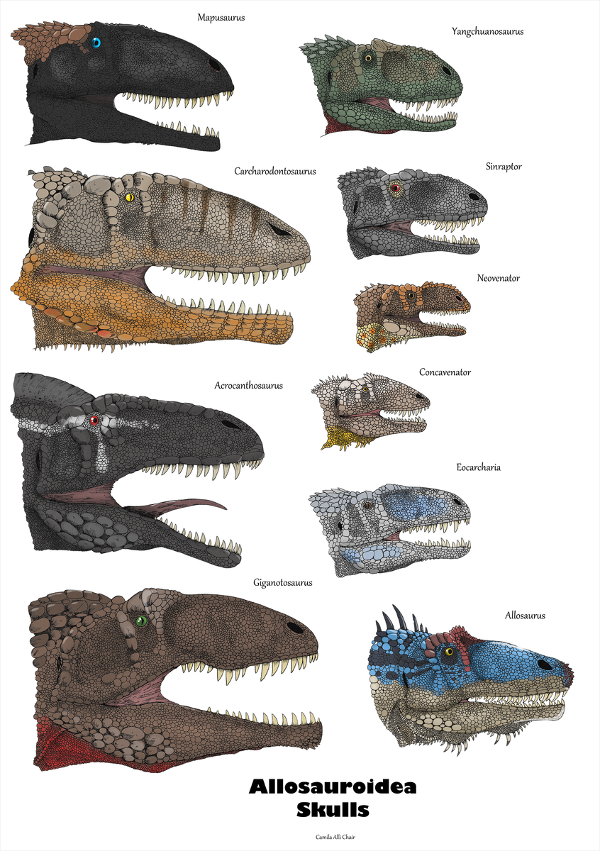 В то время как черепа тираннозаврид (Tyrannosauridae), таких как тираннозавр рекс (Tyrannosaurus rex), были приспособлены для мощного укуса, другие гигантские плотоядные динозавры, такие как мегалозавроиды (Megalosauroidea) и аллозавроиды (Allosauroidea), обладали гораздо более слабыми укусами и специализировались на «резке» и разрывании плоти, согласно анализу палеонтологов Бристольского университета.
